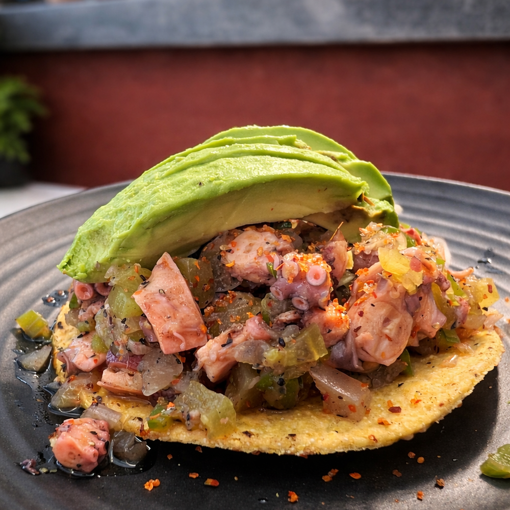 Pulpo picadito marinado en limón con pepino, cebolla morada, chile serrano, tajín y pimienta negra. Un clásico