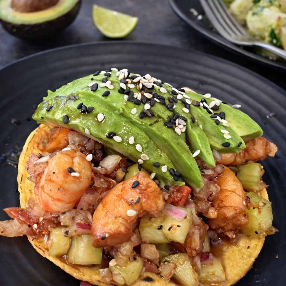 Camarón cocido, aguacate, cebolla morada, pepino, tomate, salsas negras. Así mero.