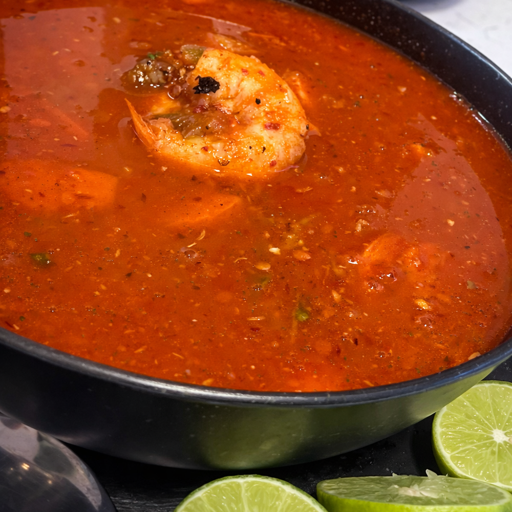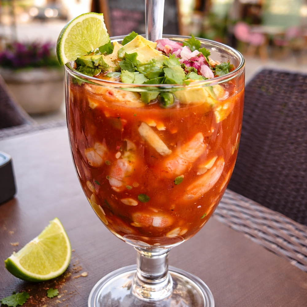 Camarón cocido en caldo de camarón y un toque de clamato, pepino,tomate,cebolla morada, lleno de sabor, fresco, ligero y todo un clásico.