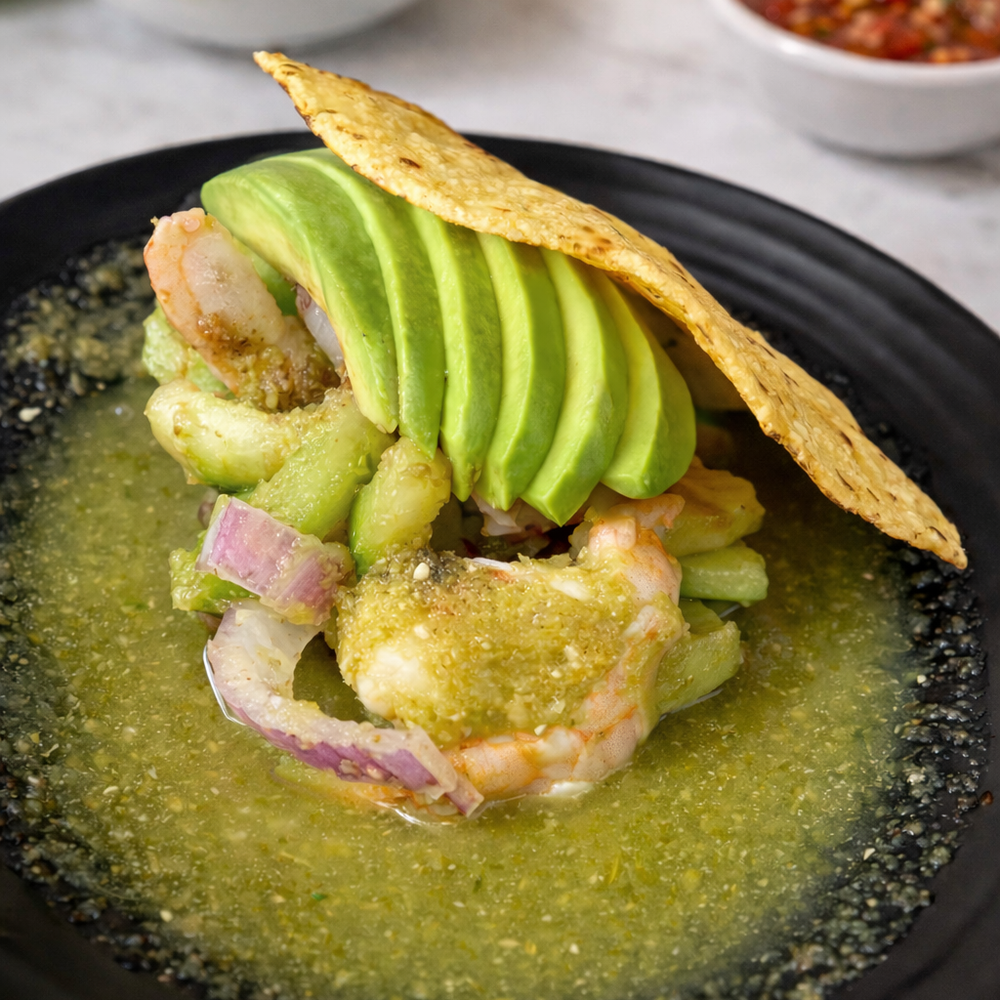 Camarón cocido, aguacate, limón, cebolla y nuestra salsa de aguachile negro. Una no es ninguna.