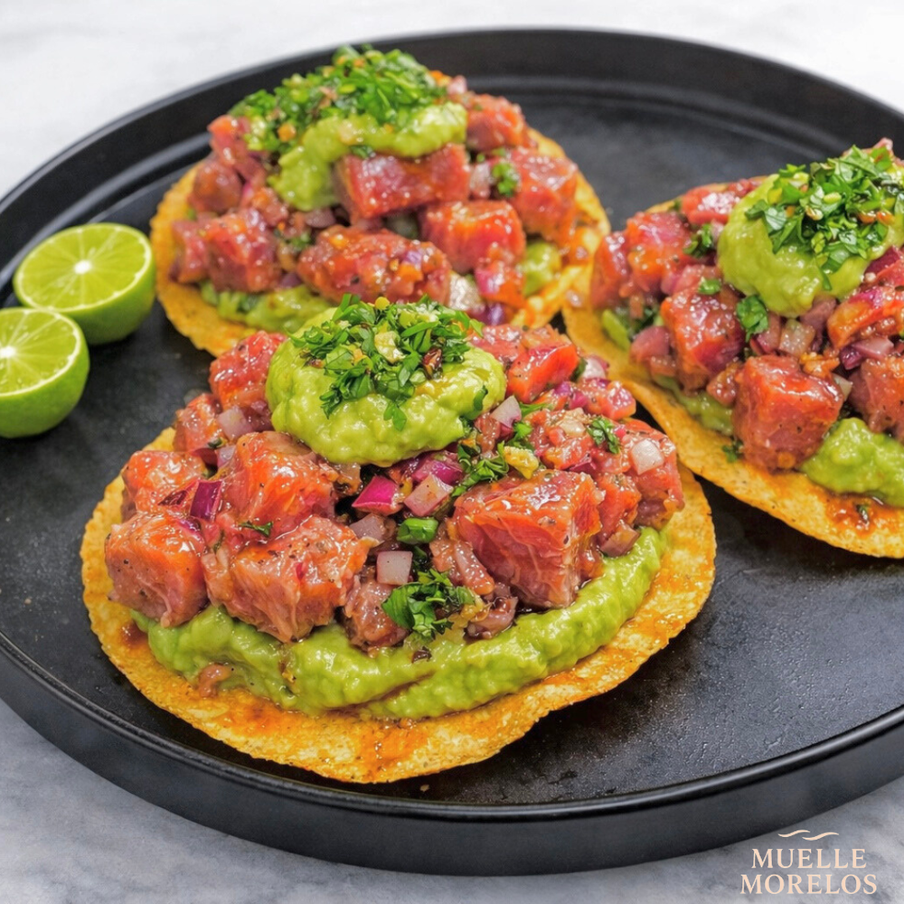 Atún fresco con bastante aguacate,cebolla morada, toque de limón y salsas negras. La de casa.