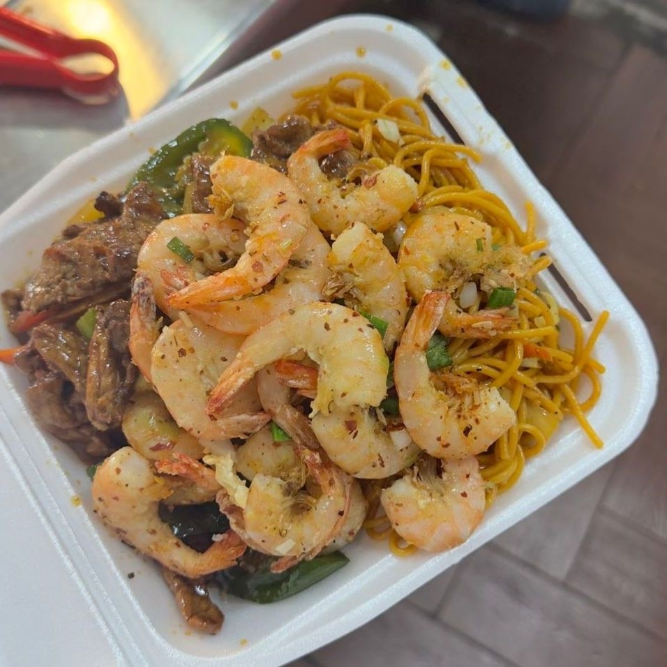 Arroz frito con pollo, res y camarón.
