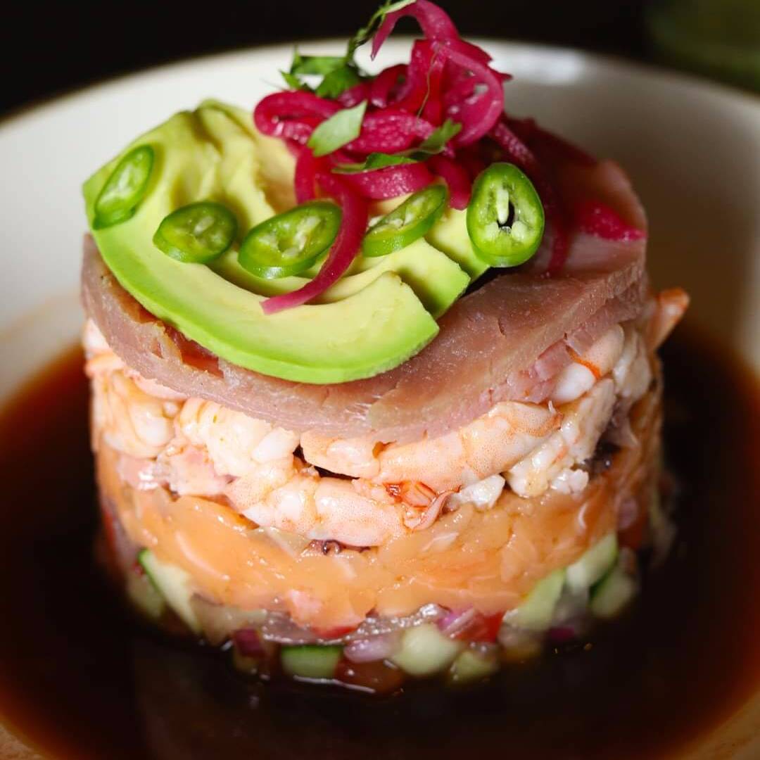 Tostada de camarón, pulpo y pescado, aguacate, pepino, tomate, cebolla morada y aferezo chipotle.