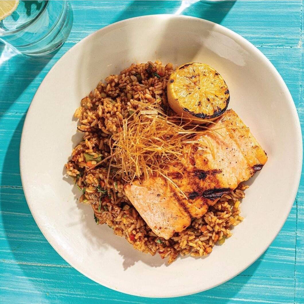 Salmon en mantequilla-limon rostizado a la parrilla, acompañado de un delicioso arroz y lechugas mixtas