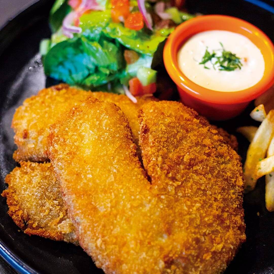clasico filete de pescado empanizado en panko, acompañado de papas a la francesa, aderezo de la casa o aderezo tartara