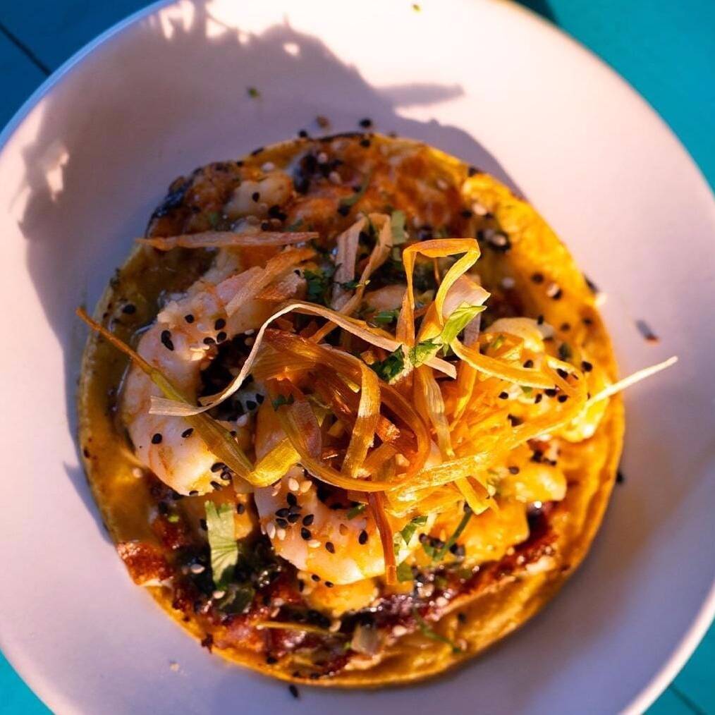 Taco en costa de queso acompañado de nuestro guiso especal de camarones gobernador.
