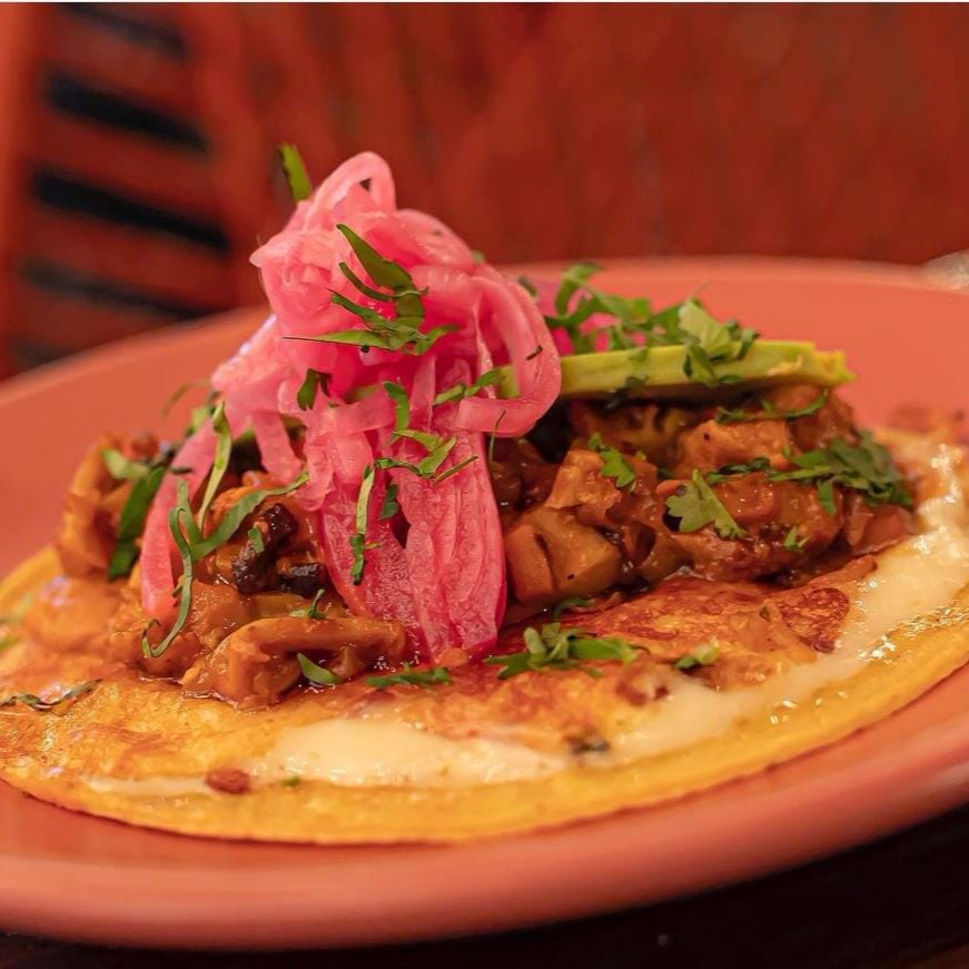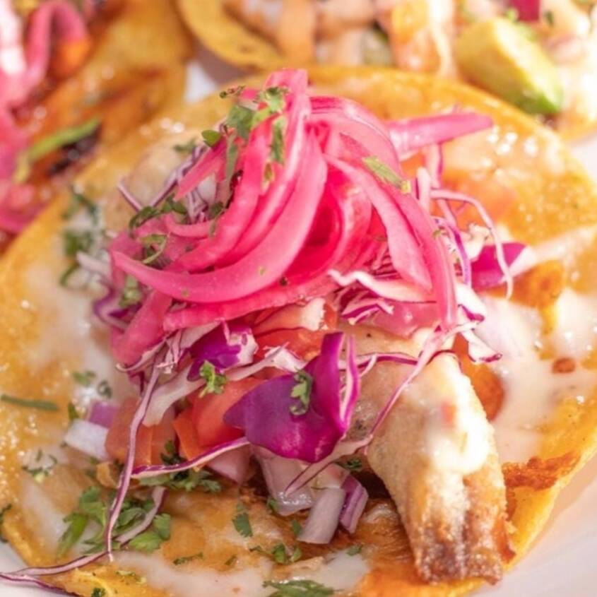 Taco en costra de queso, guiso de marlin a la mexicana con aderezo de chipotle y cebolla encurtida
