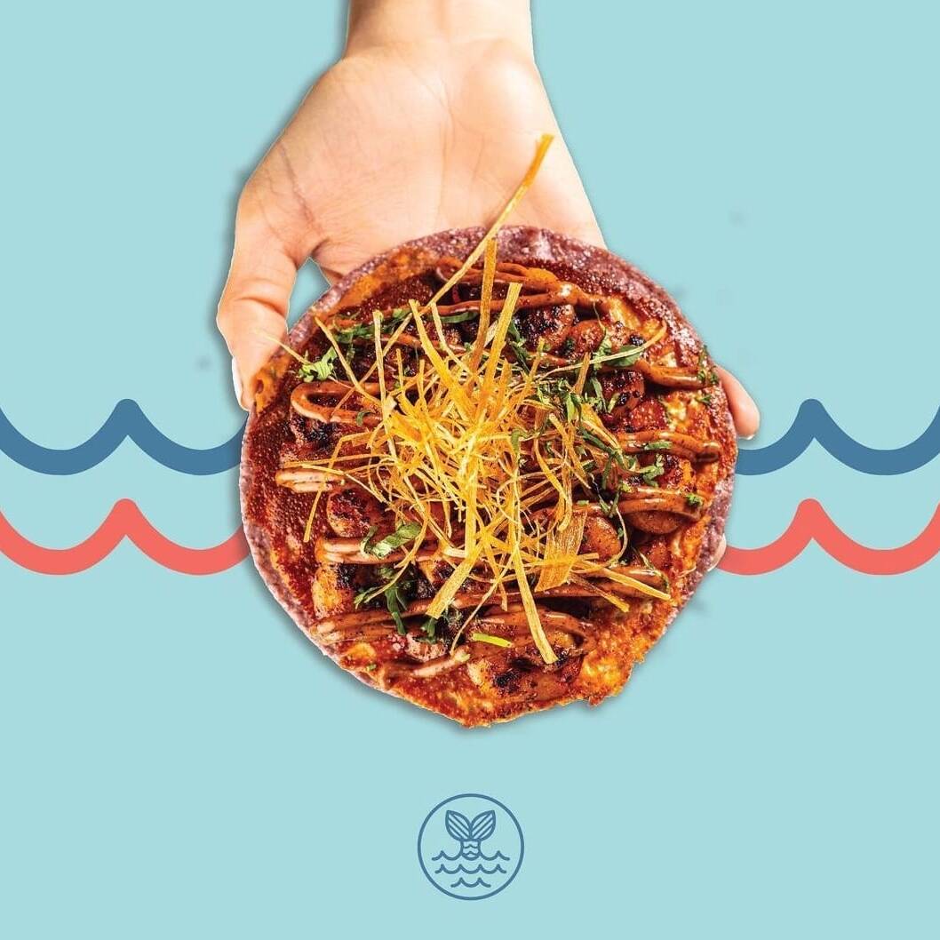 Taco de pulpo salteado con chipotle, tomate, cebolla y aceitunas.