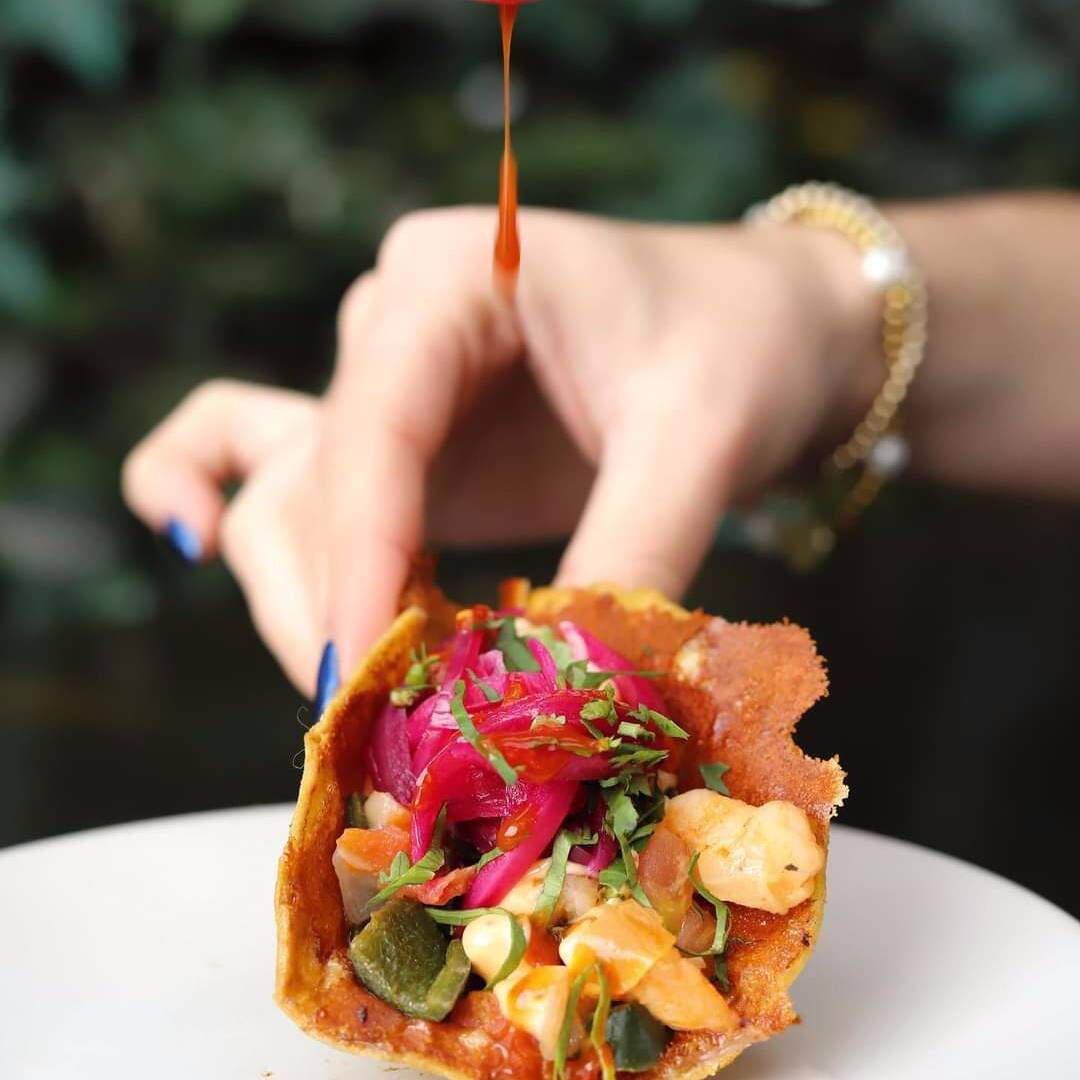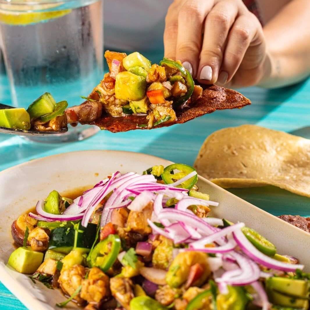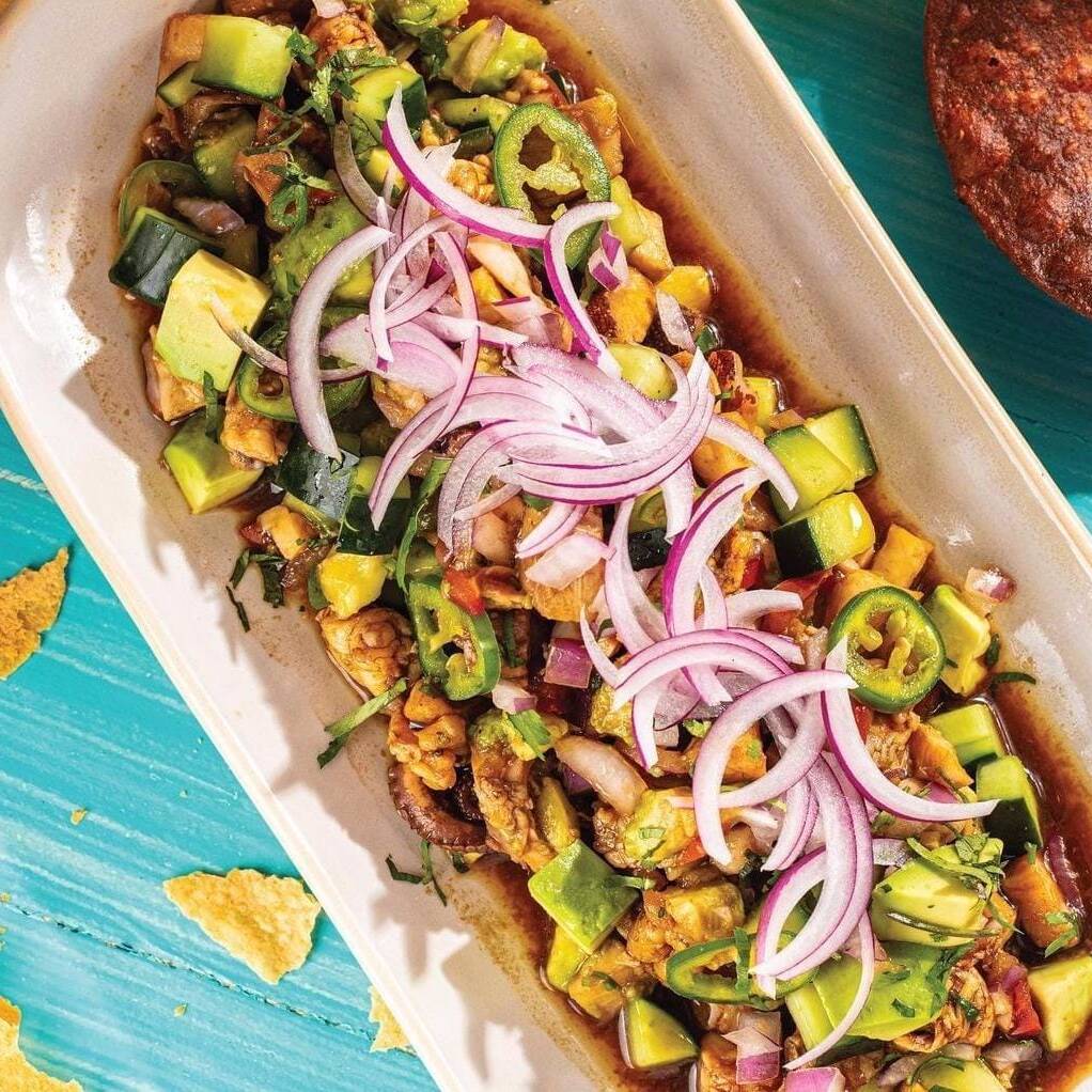 chicharr,on de atun, banado en salsa pibil, acompañado de aguacate, chile serrano y pico de gallo