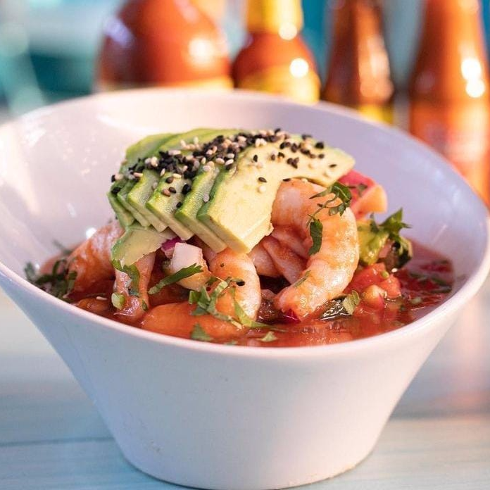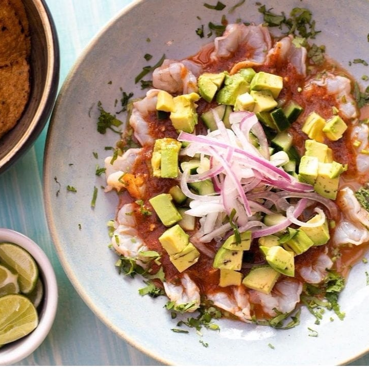 Tostada de ceviche de camarón, aguacate, pepino, tomate, cebolla morada y aferezo chipotle.