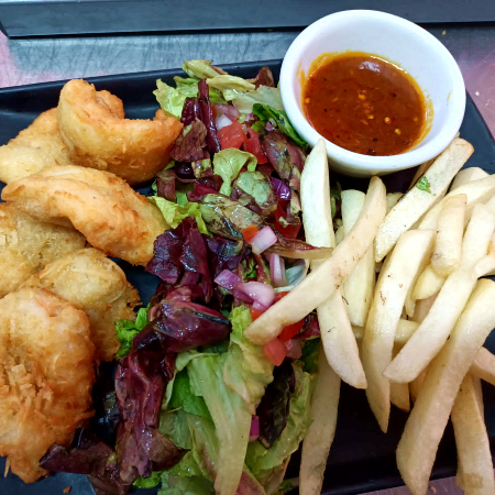 Camarones empanizados en panko y coco, acompañados de ensalada de la casa, papas fritas y ensalada de mayo spacy
