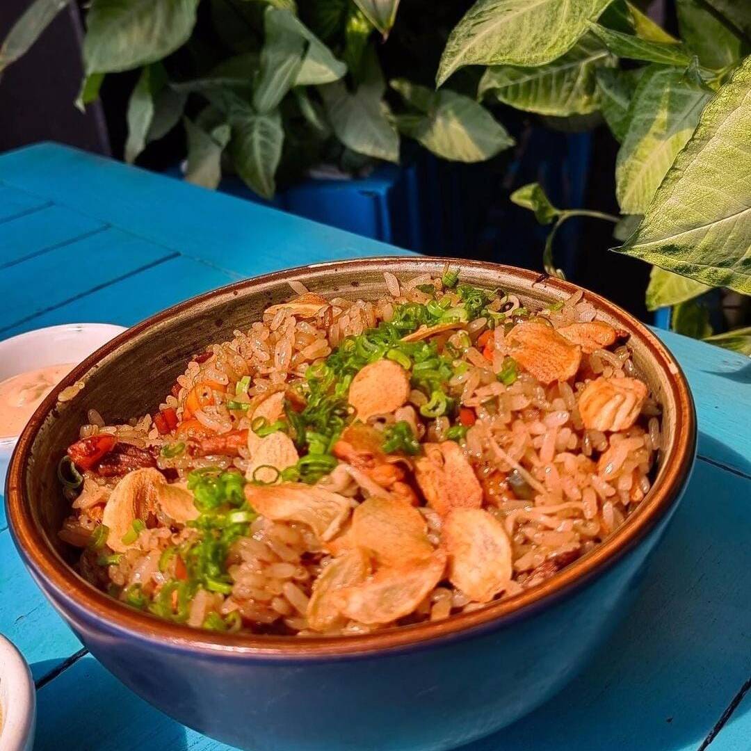 mas de medio kg de arroz japones con camaron, pollo, res, cangrejo, verduras y chips de ajo frito