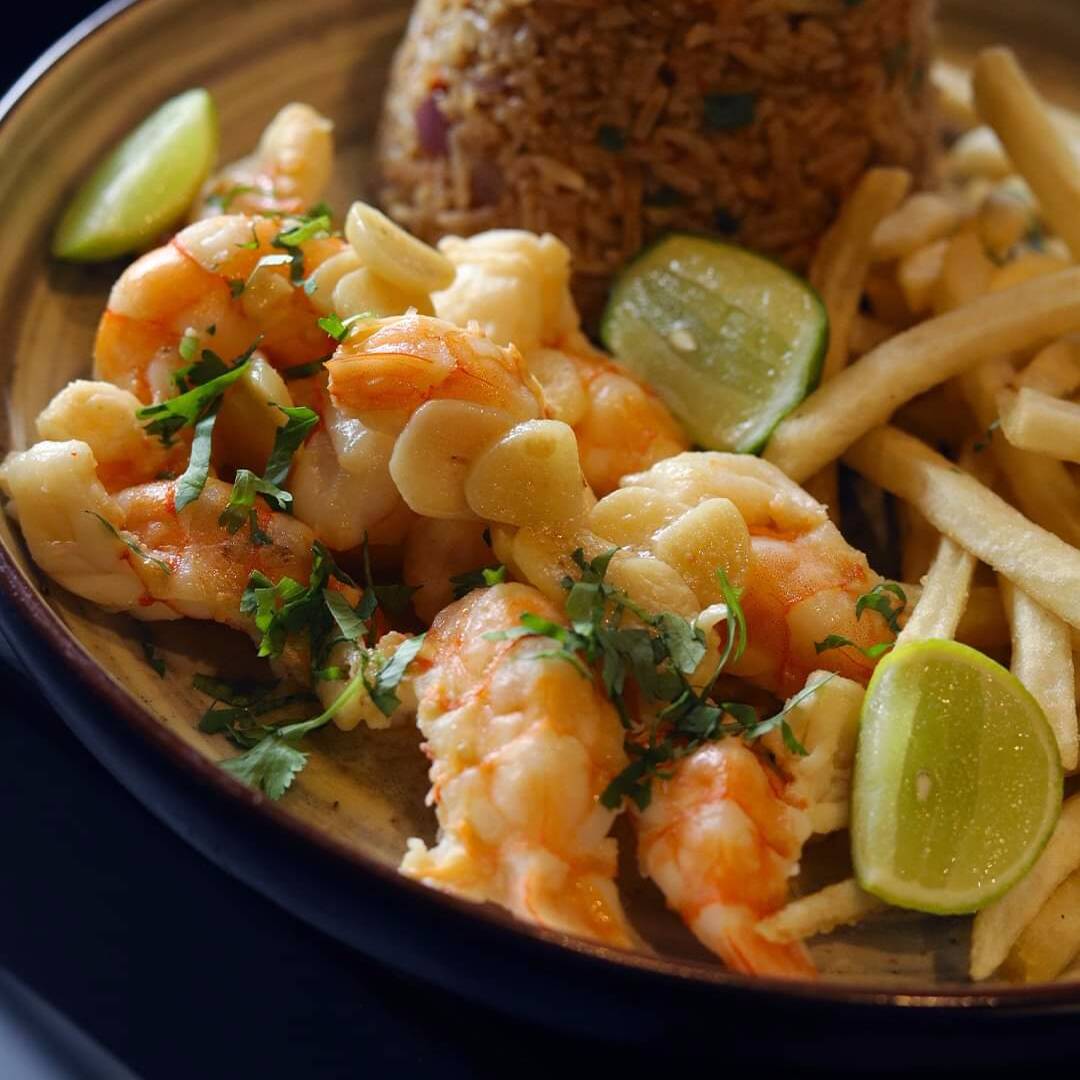 Camarones Salteados en laminas de ajo, acompañados de paaps a la francesa y arroz a al mantequilla