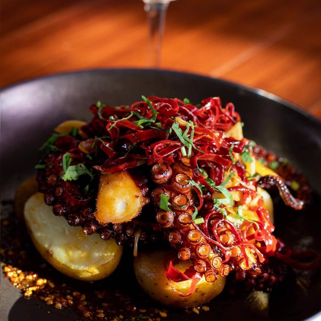 Pulpo salteado al ajillo, chile guajillo y guacamole acompañado con papas confitadas