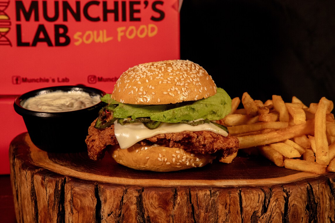 Pan brioche, pechuga de pollo, aderezo chipotle y pepinillos.