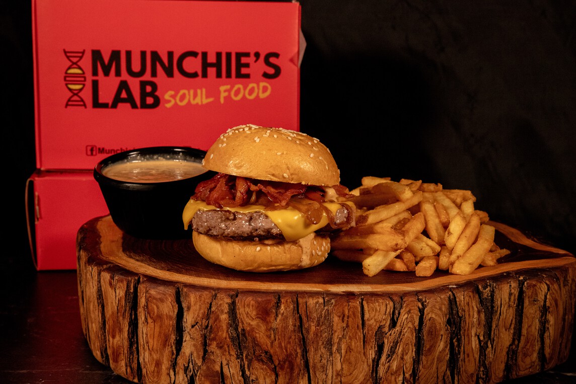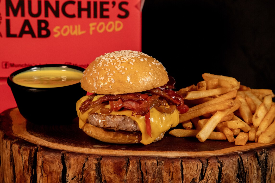 Pan brioche, carne prime, aderezo animal style, cebolla y pimiento rojo caramelizados, queso y tocino.
