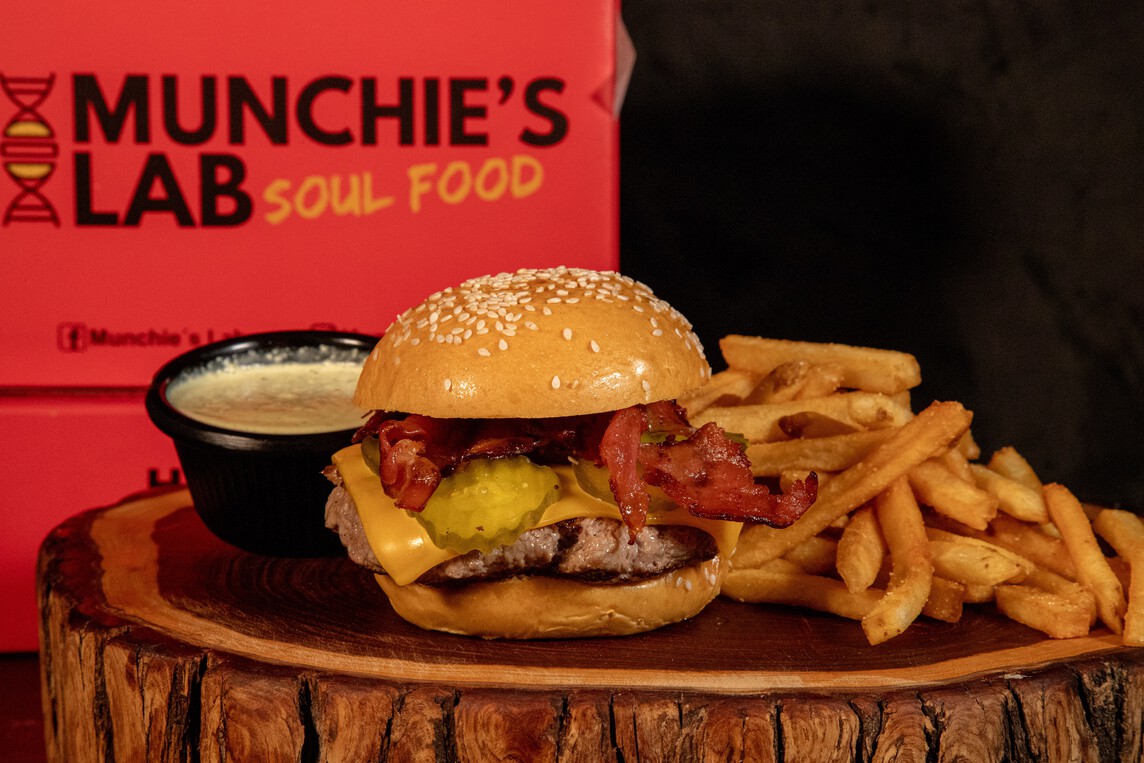 Pan brioche, carne prime, aderezo de pepinillos, queso, tocino y pepinillos.