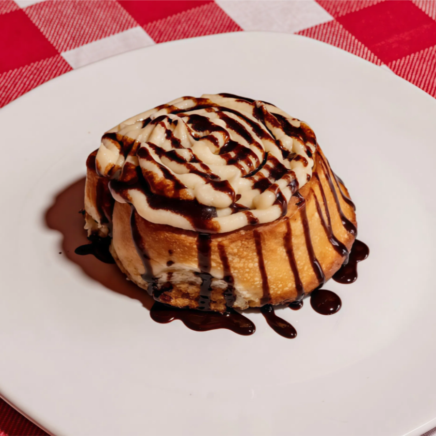 Un Delicioso rol de canela, bañado con rico glass y chocolate Hershey.