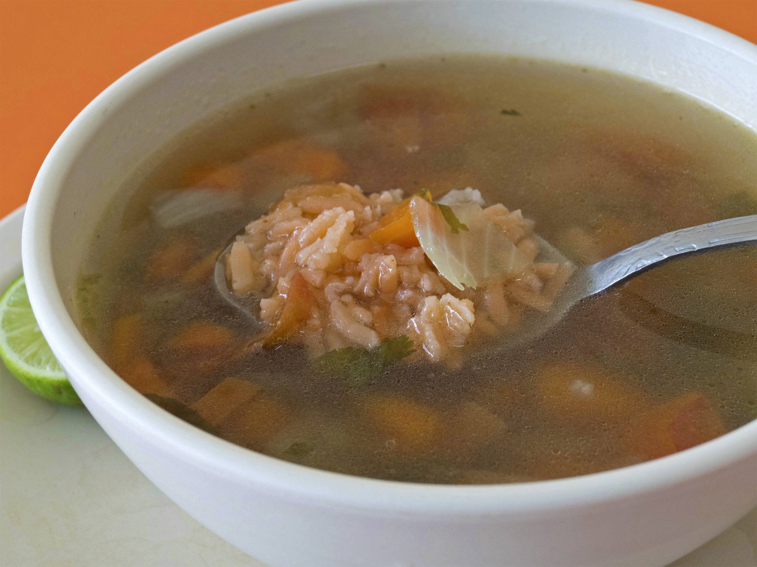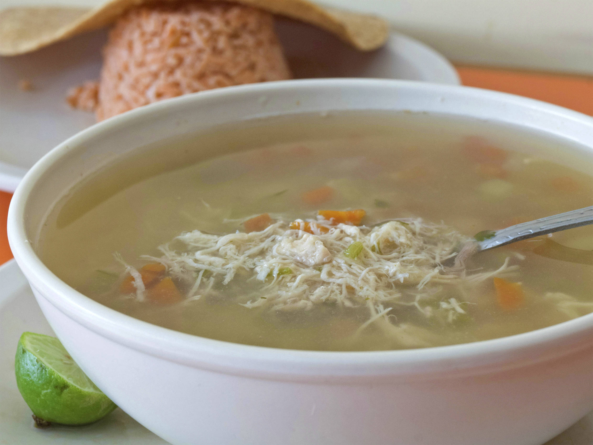 medio litro de consome acompañado de sopa arróz.