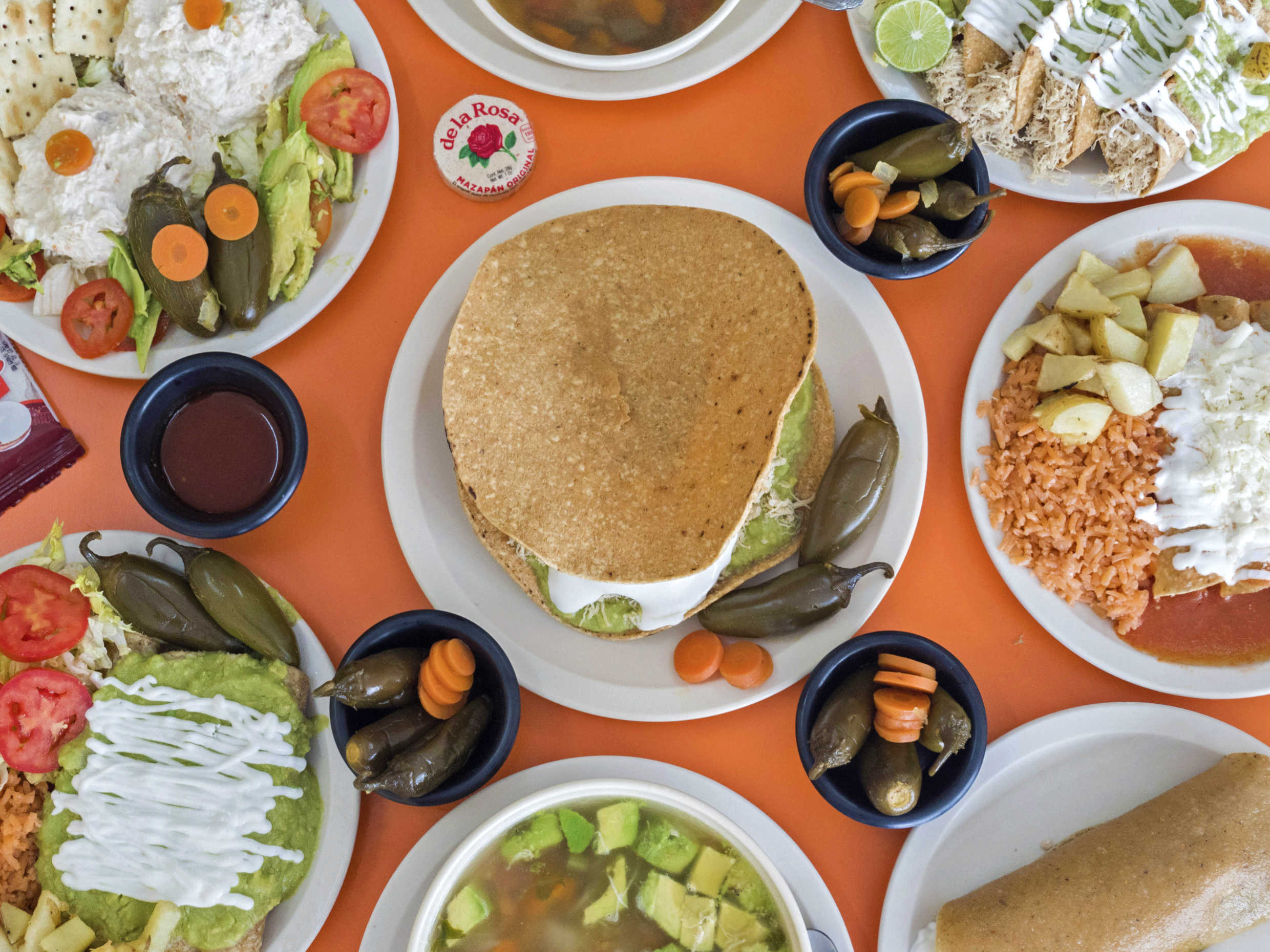 4 tacos bañados con guacamole y crema, acompañados de sopa de arroz, ensalada de lechuga y papas fritas.