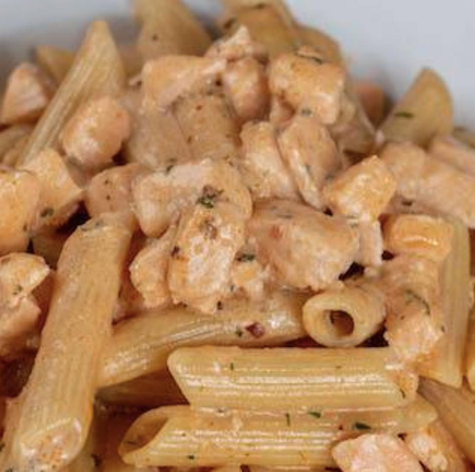 (pasta corta con salmón en salsa rose)