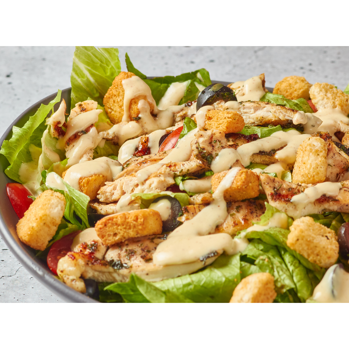 Rica ensalada de lechuga fresca, aceituna, tomate cherry y crotones con nuestro aderezo César artesanal. Incluye pollo.