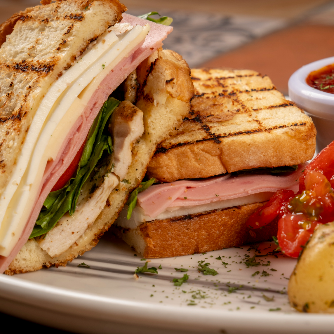 Pan brioche, pollo a la parrilla, jamón, queso panela, manchego, tomate y espinaca, acompañado de papas. Incluye café.
