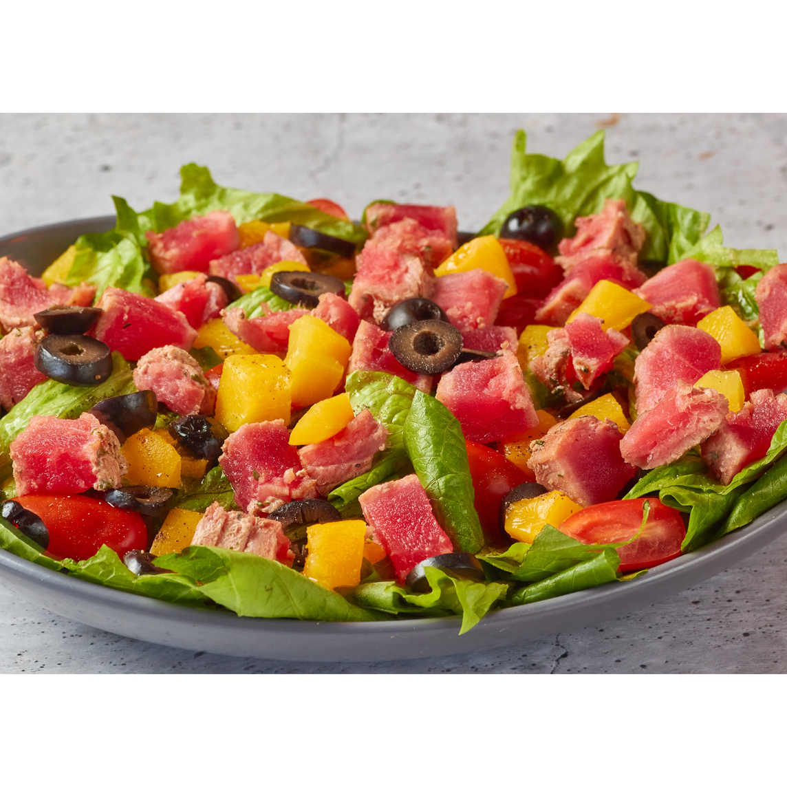 Rica ensalada con lechuga, tomate cherry, aceitunas y durazno acompañado de un atún fresco sazonado con el sabor de Napoli.