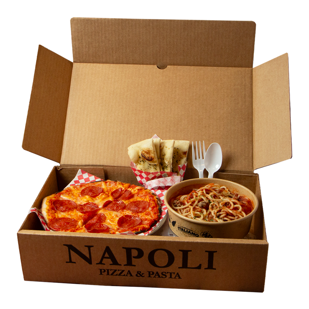 Combo de pizza y pasta tamaño individual.