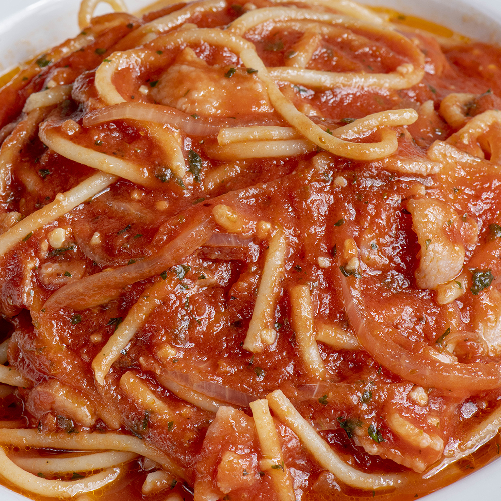 (rica salsa de tomate con tocino y cebolla)