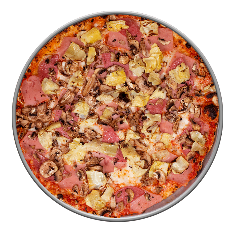 Jamón, salami, alcachofas y champiñones.