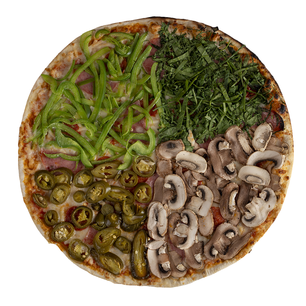 Base de salami curtido y chorizo español, dividido en cuatro partes con espinaca, pimiento, jalapeño y champiñón.