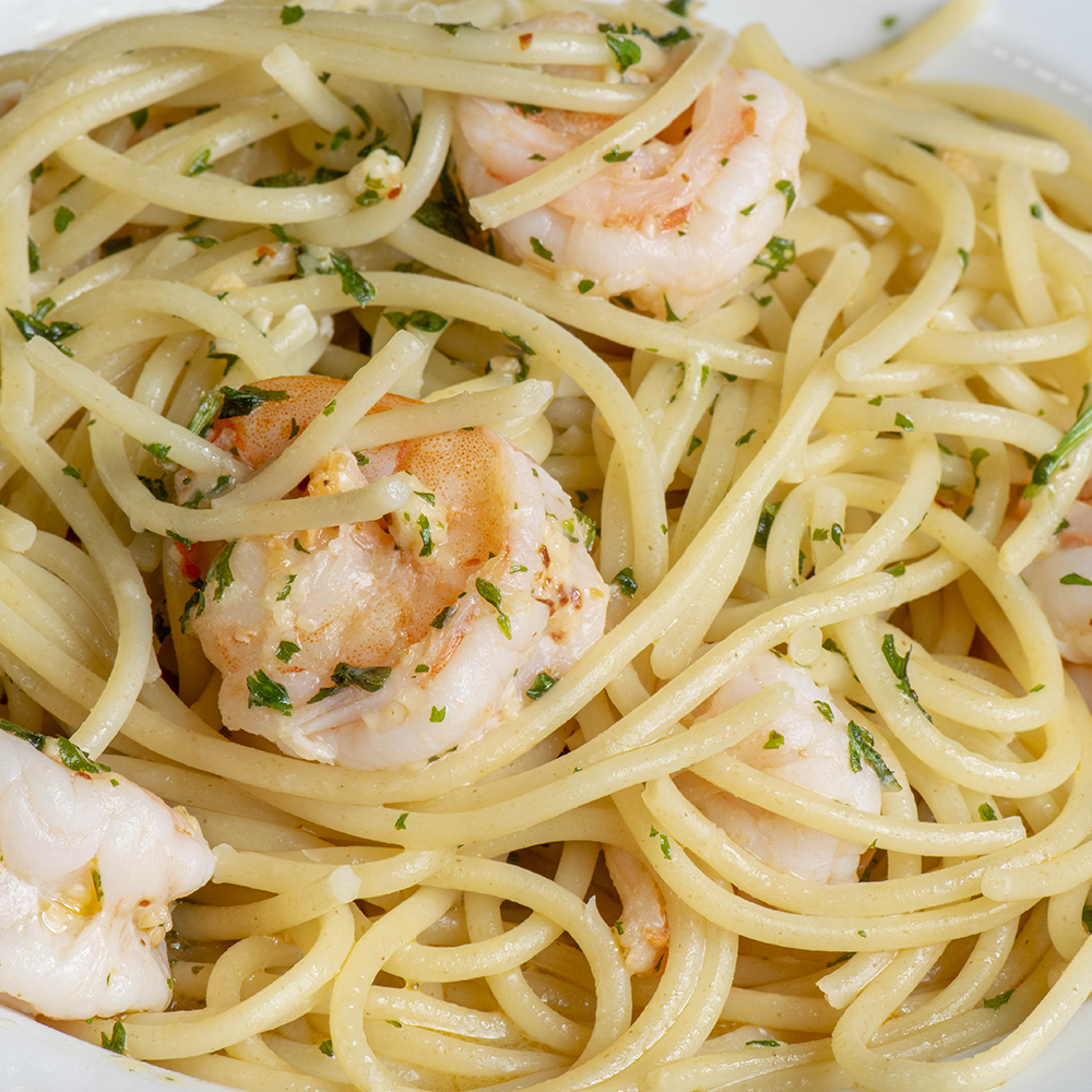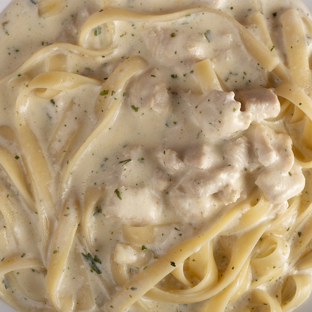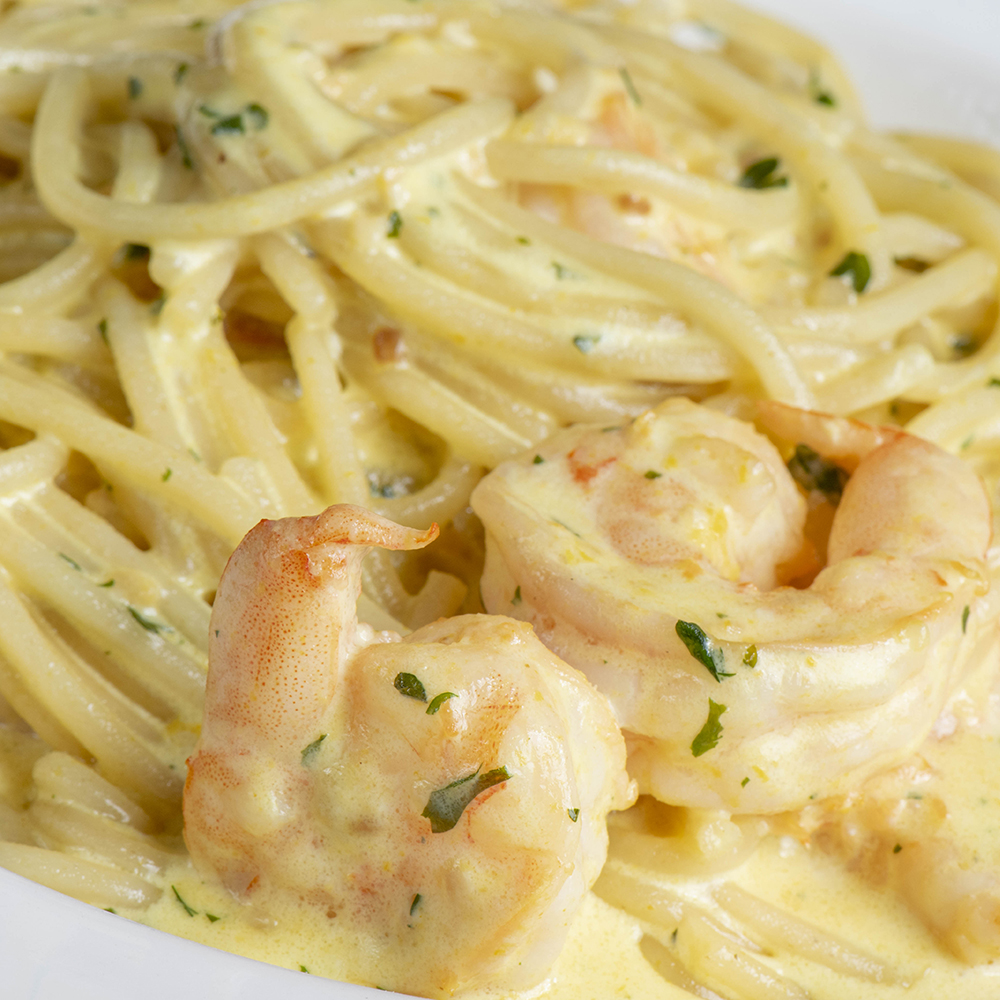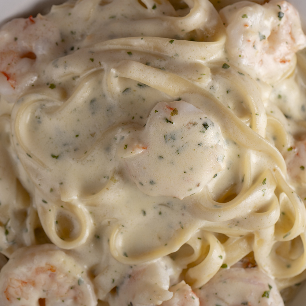 En salsa blanca cremosa con camarón y parmesano.