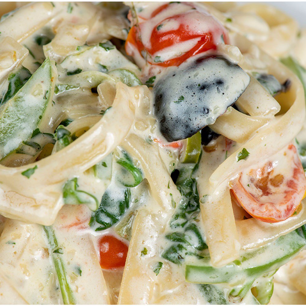 (con brocoli, espinaca, pimiento, tomate cherry, aceitunas con salsa blanca)