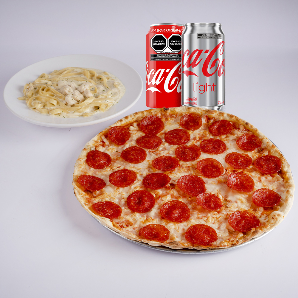 Pizza mediana(12 pulgadas) a elegir, pasta a elegir y 2 refrescos