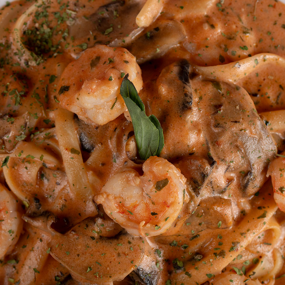 Fettuccini con camarones y champiñones en salsa rose.