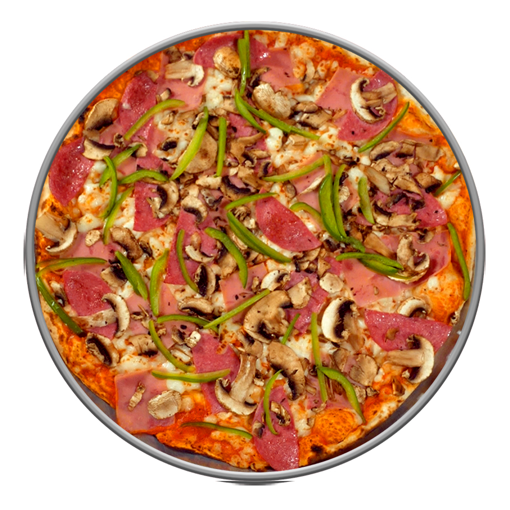 Jamón, salami, pimiento verde y champiñón.