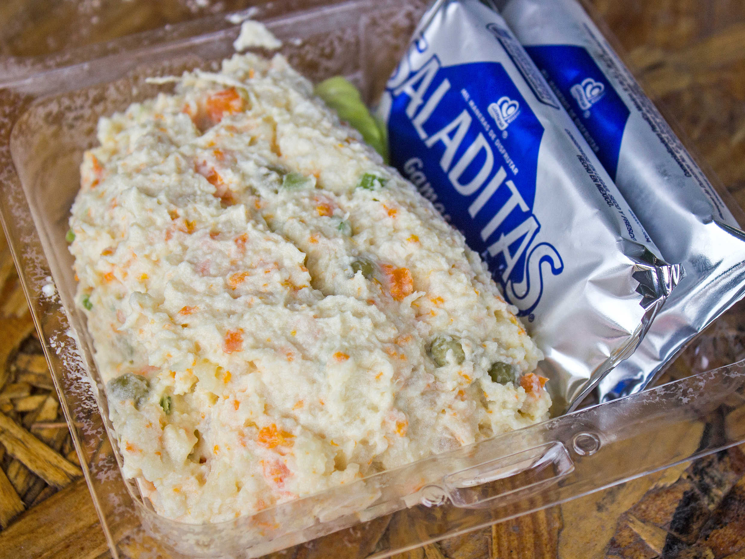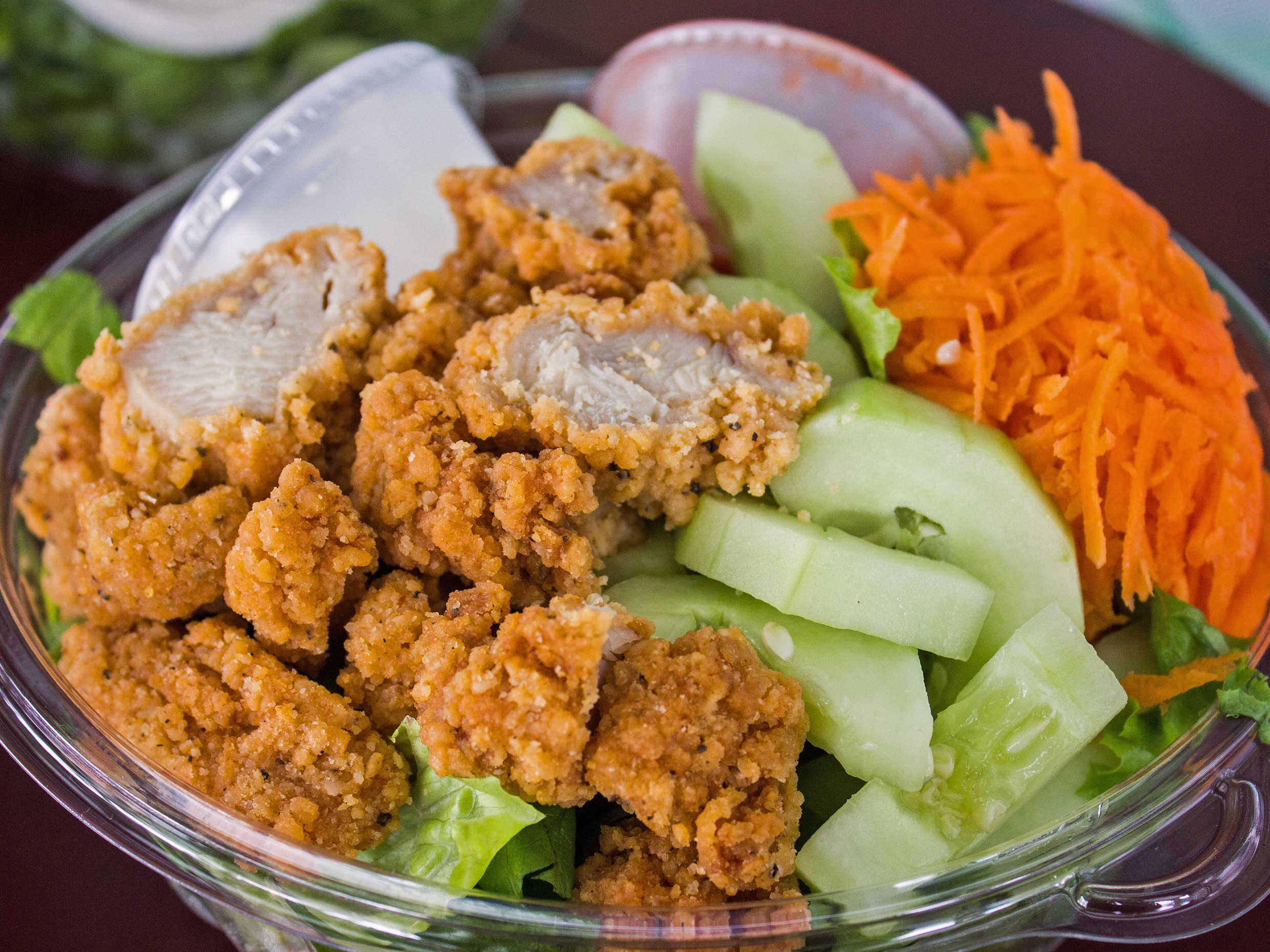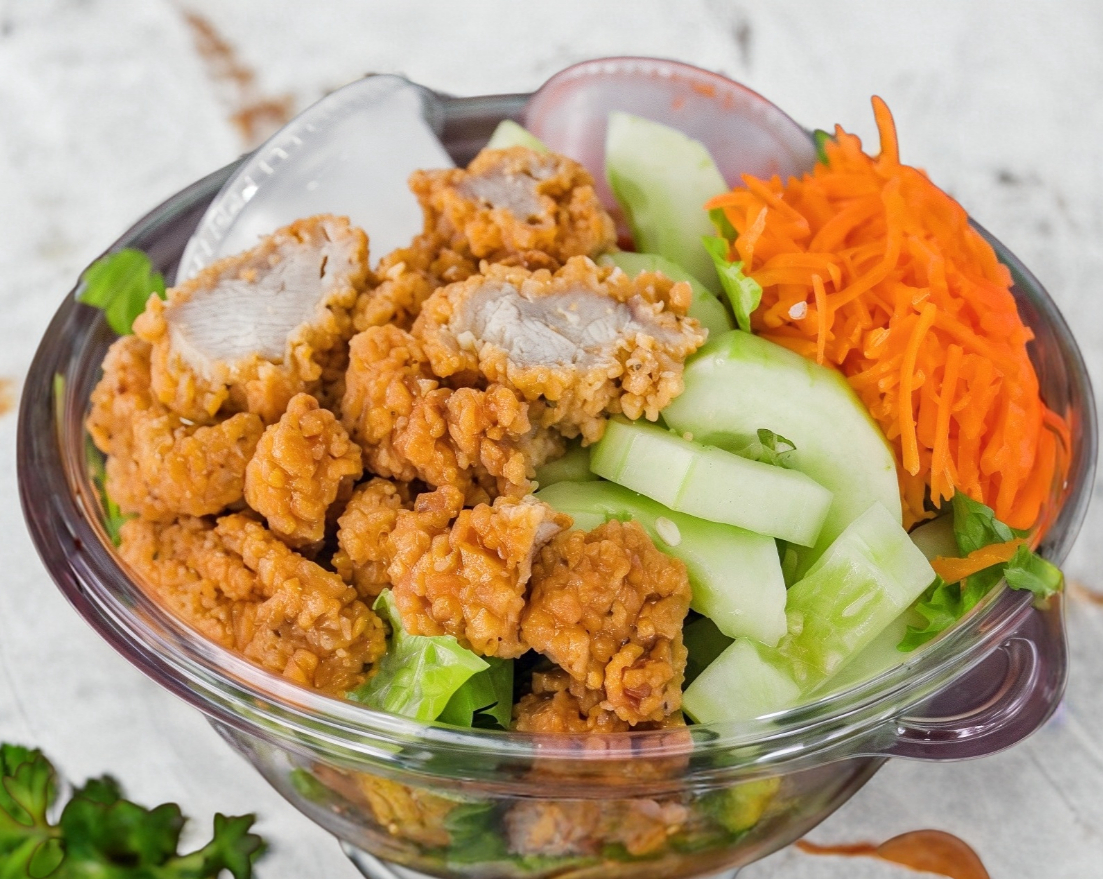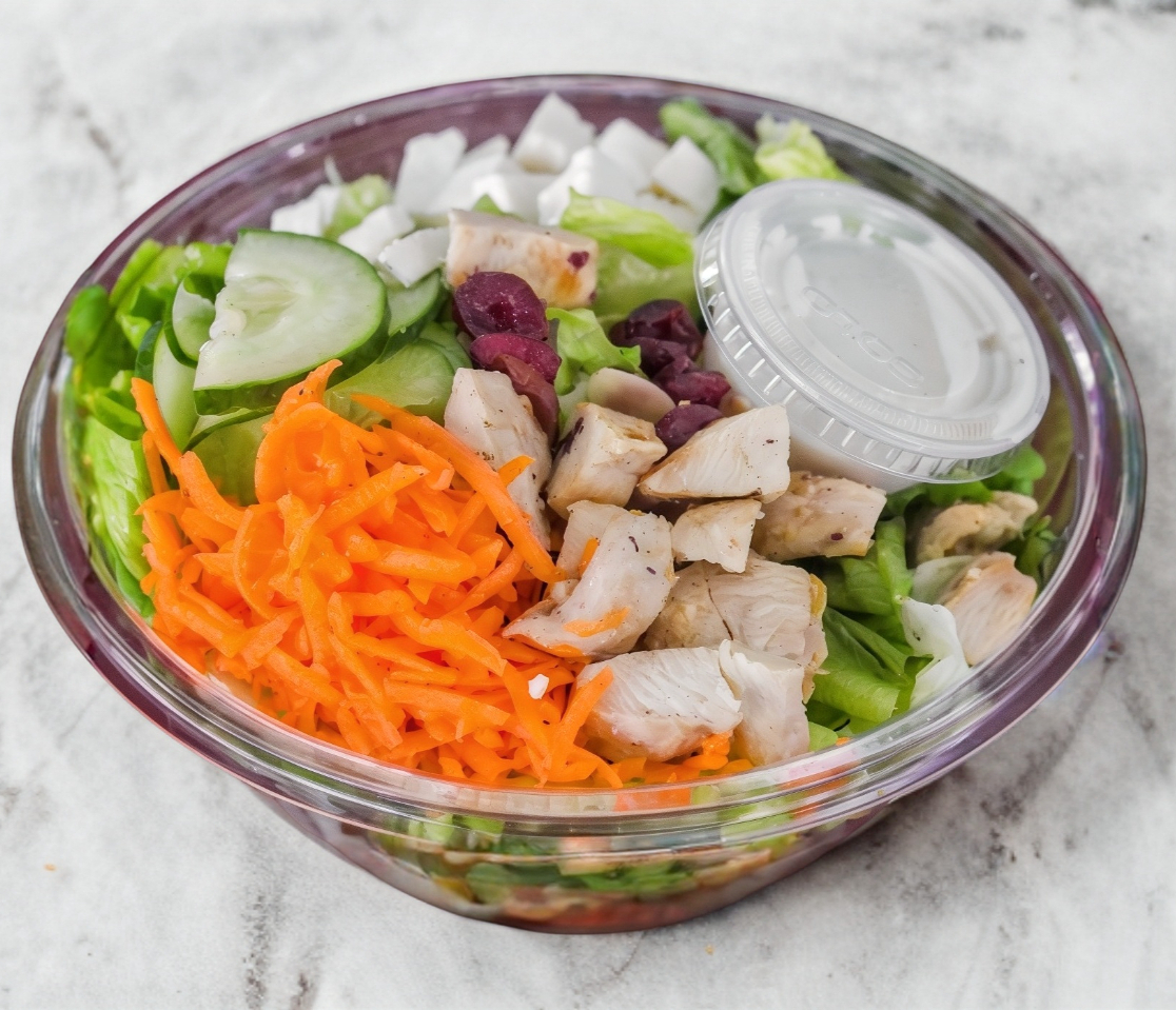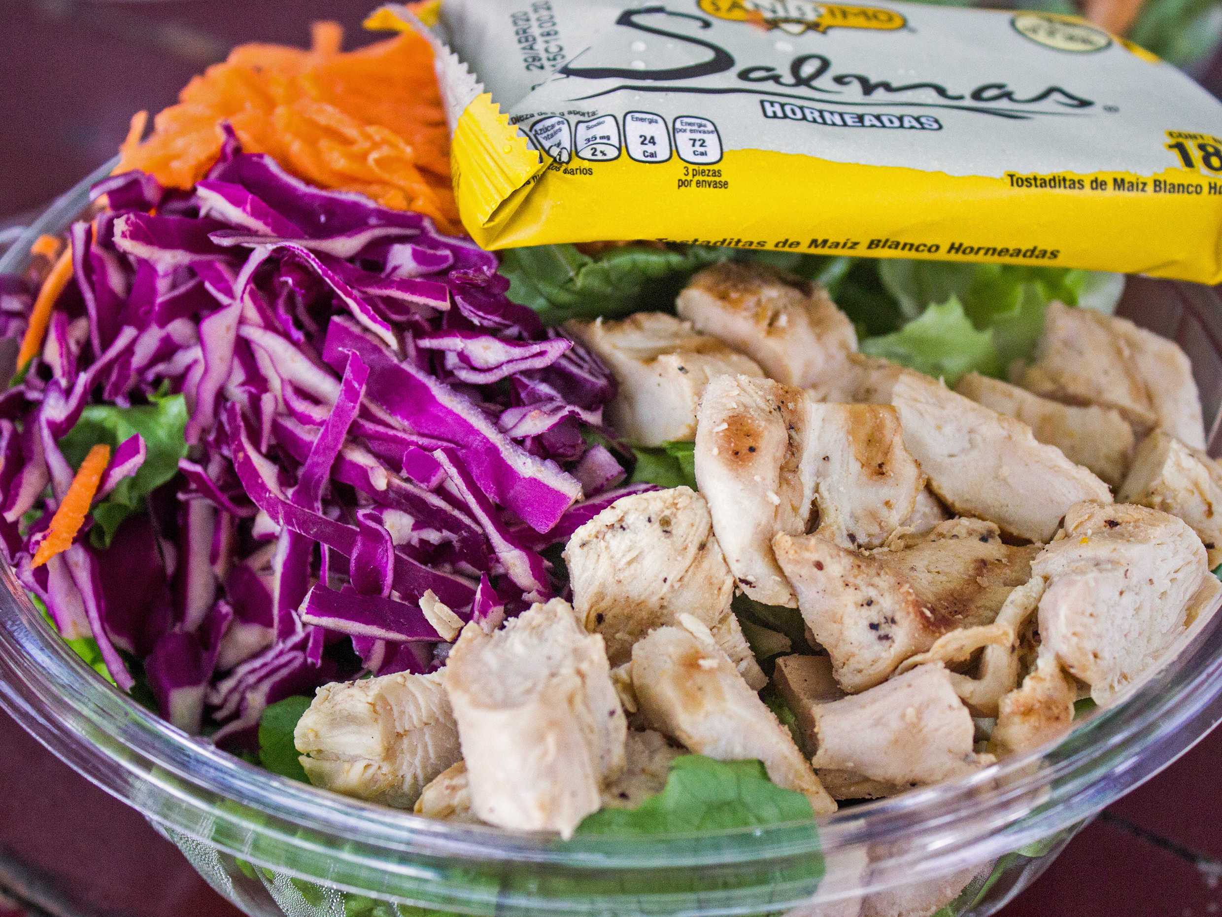 Pollo, lechuga, zanahoria, col morada, aderezo ranch y tostaditas de maíz horneadas.