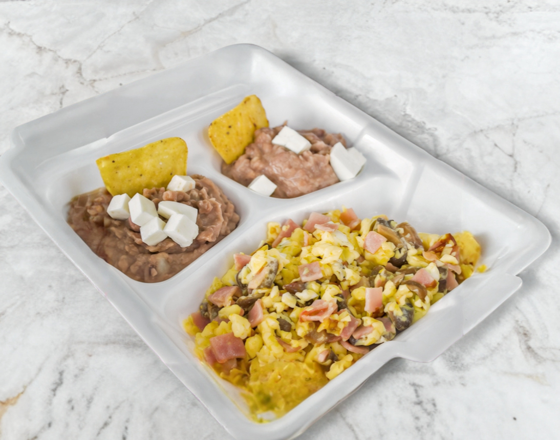 Claras de huevo con 2 ingrediente a elegir, frijoles, salsa y tortillas.