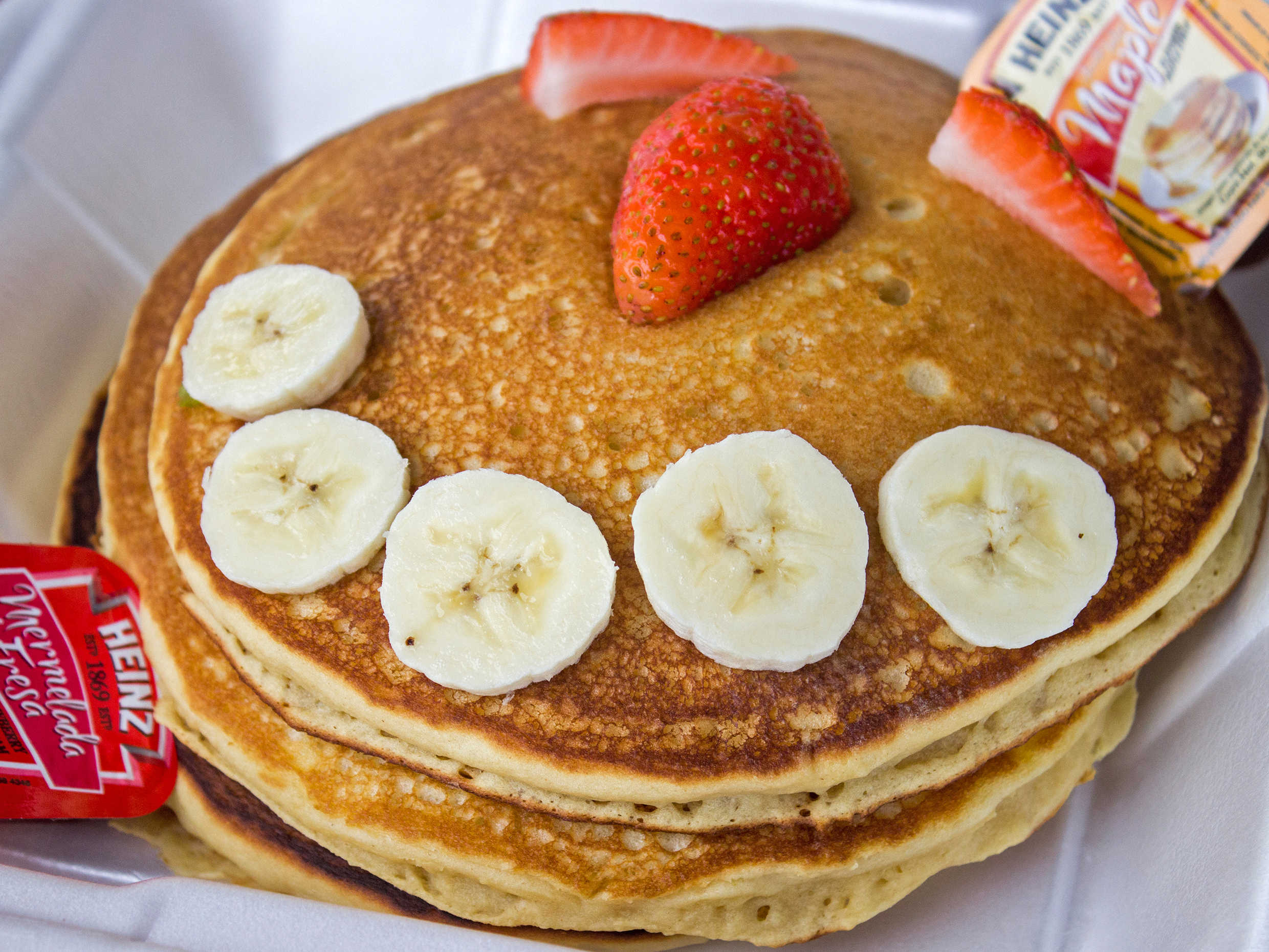 3 hot cakes, miel, mantequilla y mermelada.