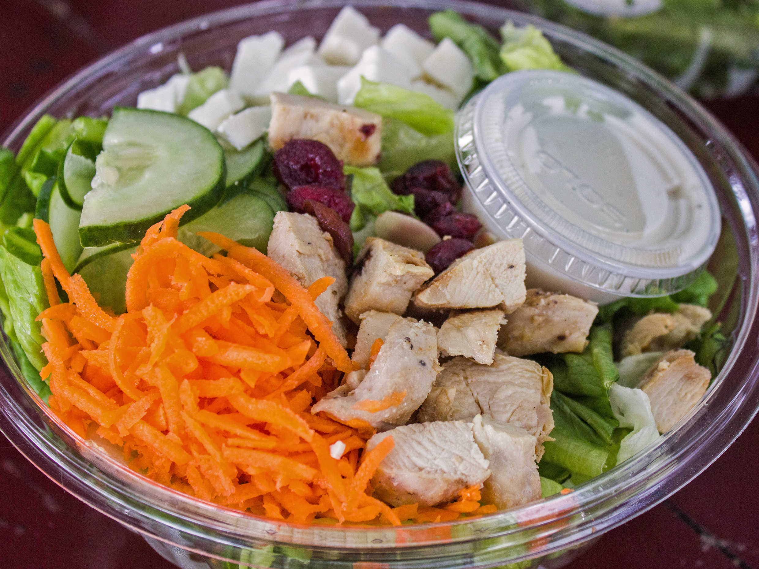 Lechuga orejona, lechuga italiana, zanahoria, pepino, arándano, queso panela, pechuga de pollo y aderezo blue cheese.lue cheese