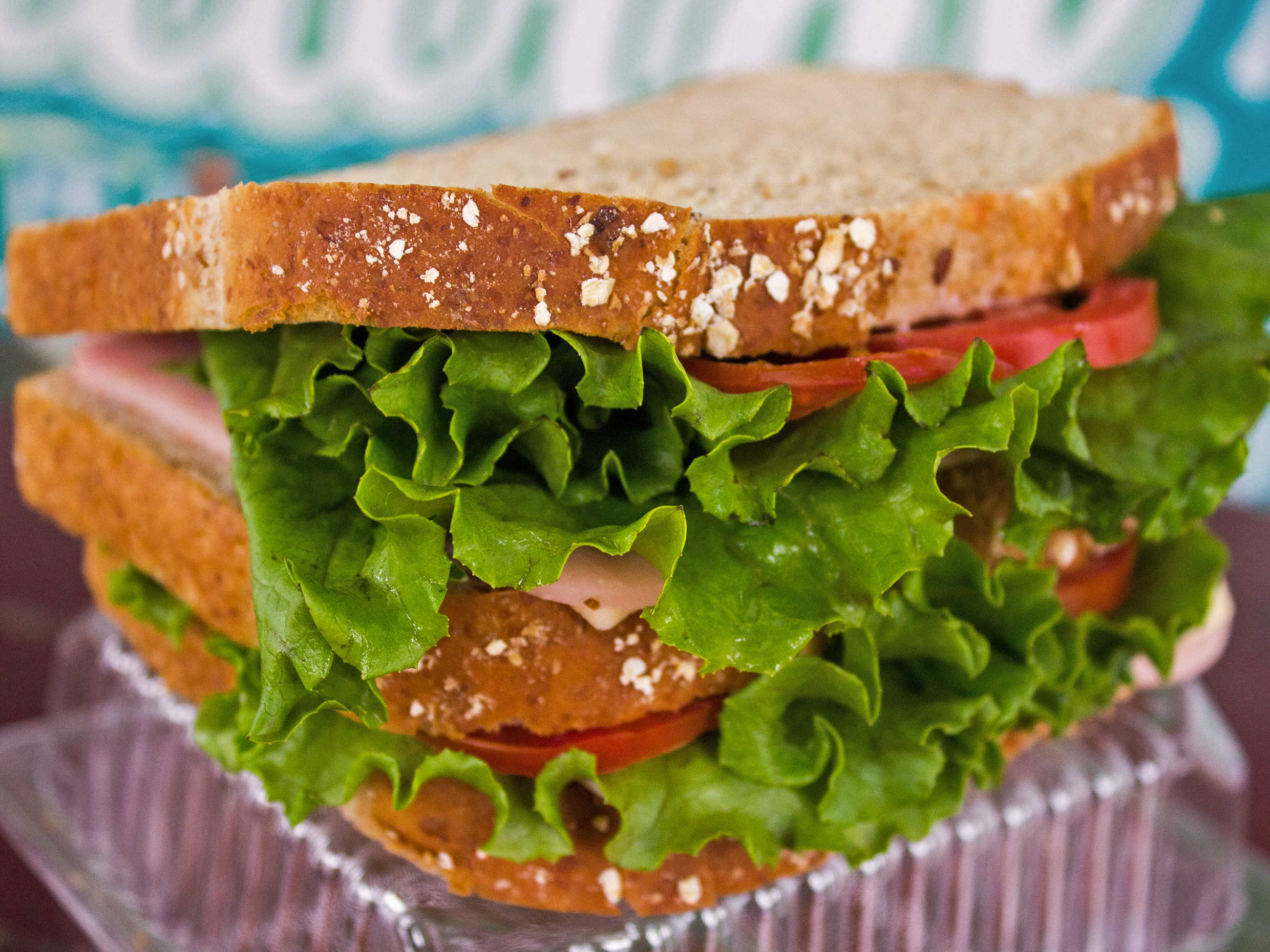 Pan doce granos, jamon de pavo, queso gouda,tomate y lechuga.