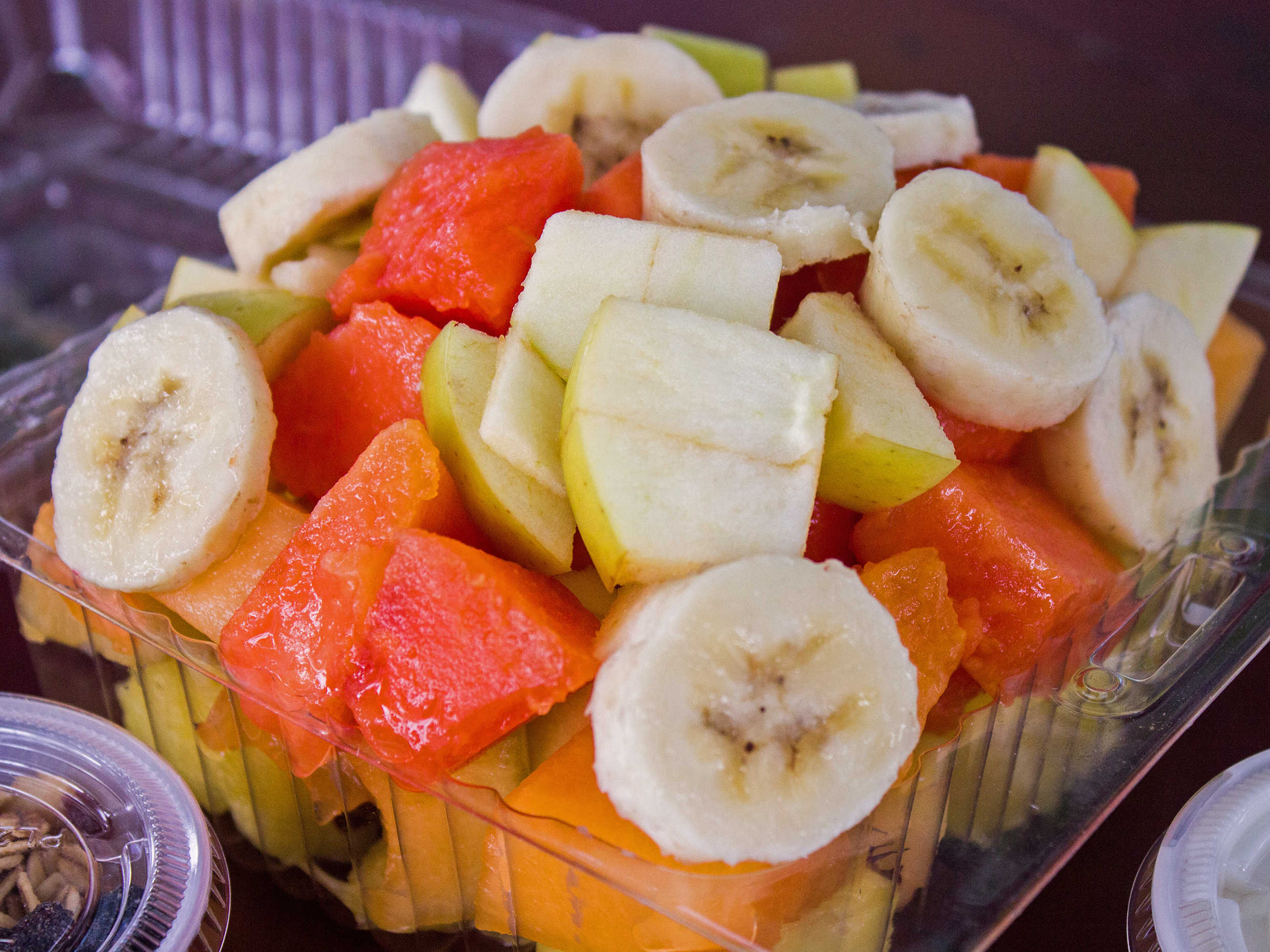 Piña, papaya, melón, plátano y manzana. Con miel, yogurth y granola.