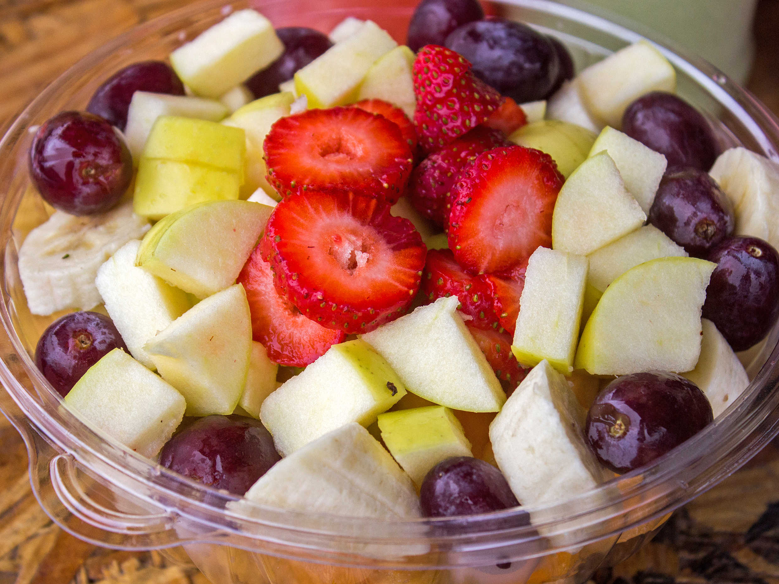 Piña, melón, plátano, uvas, fresa y manzana. Con miel, yogurth y granola.