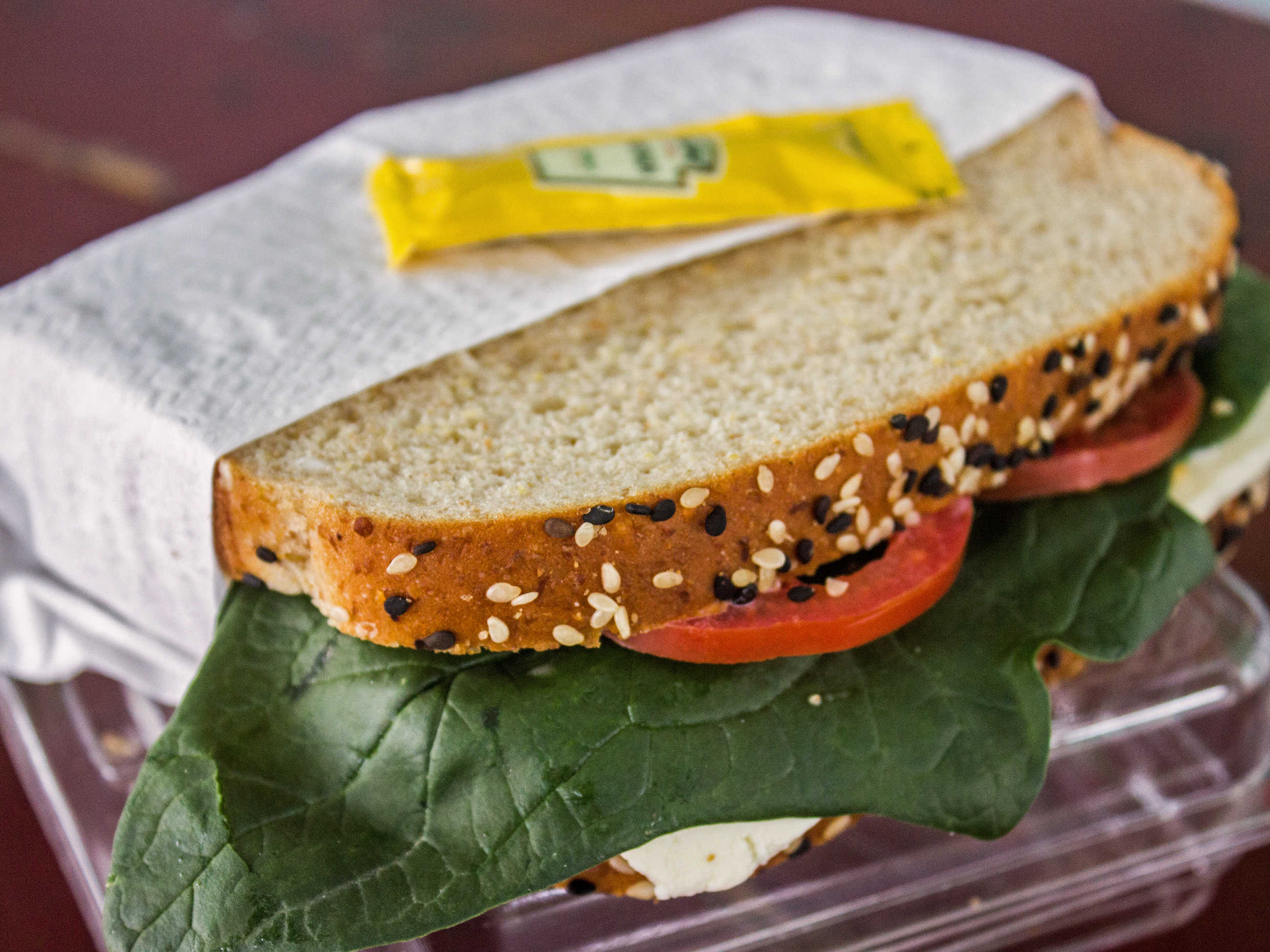 Queso panela, espinaca, tomate, mayonesa y mostaza.