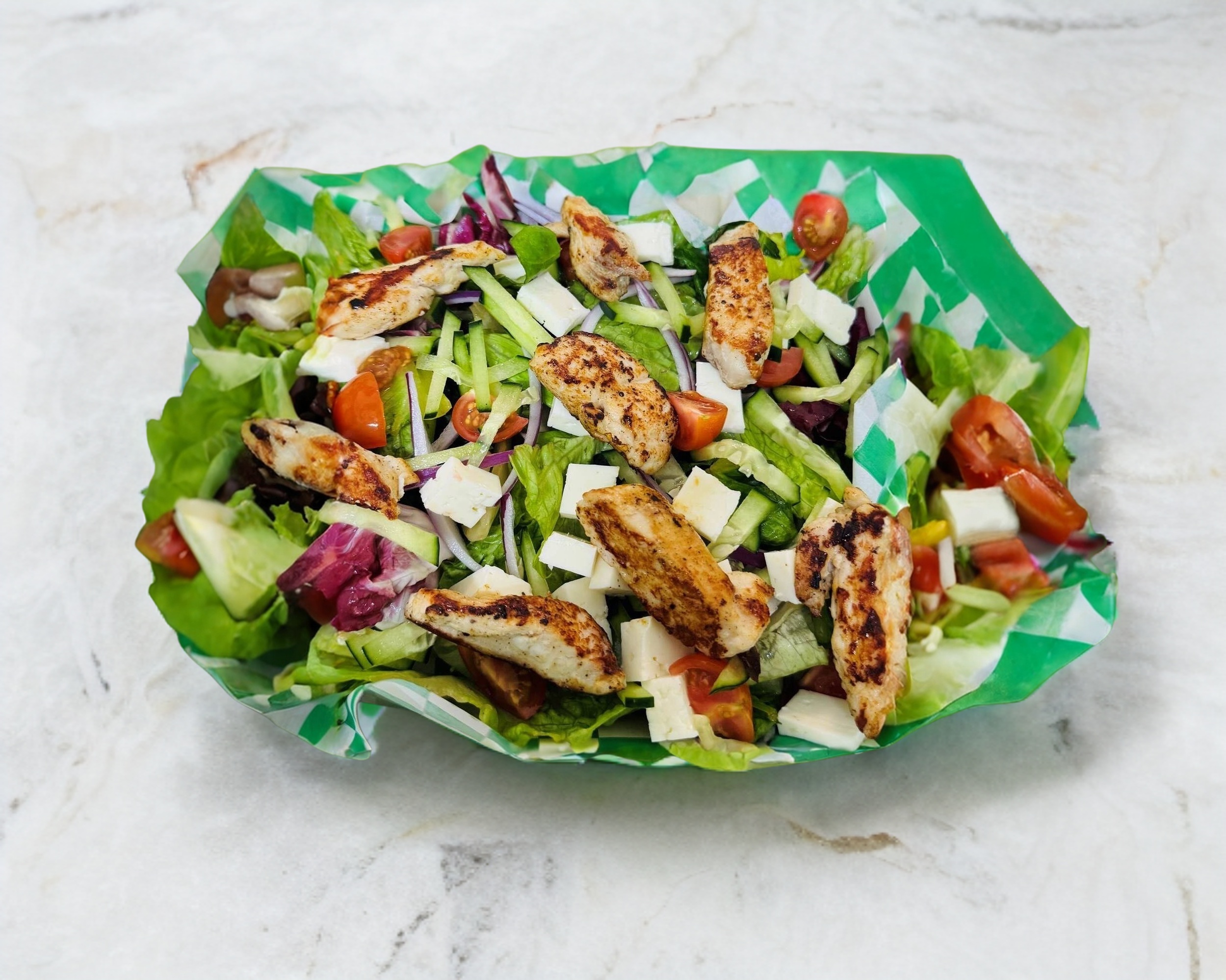 Ensalada tipo césar, base de lechuga, Fajita de pechuga de pollo a la plancha, tomate, queso parmesano, aderezo tipo César y crotones.