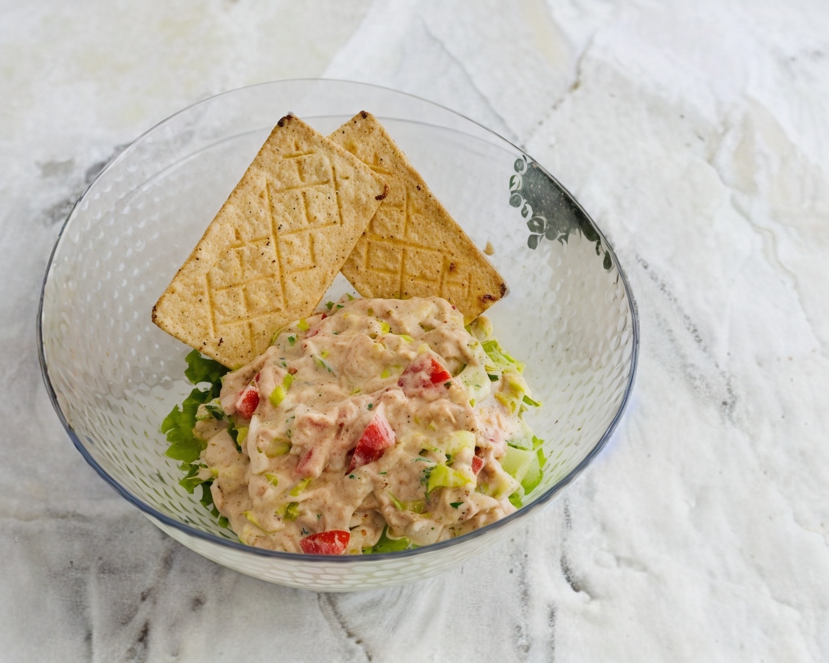 Ensalada a base de atún con tomate, pepino, cebolla, cilantro, lechuga y mayolight. Incluye 1 paquete de salmas.