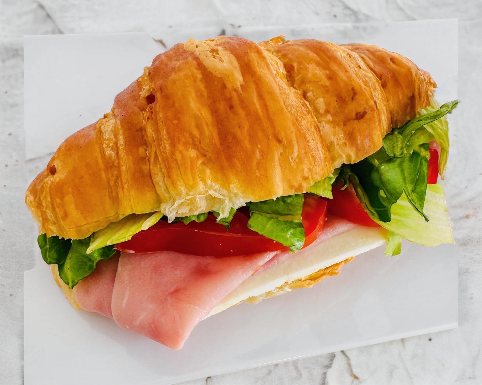Croissant de jamón de pavo y queso panela, con lechuga, tomate y mayonesa.