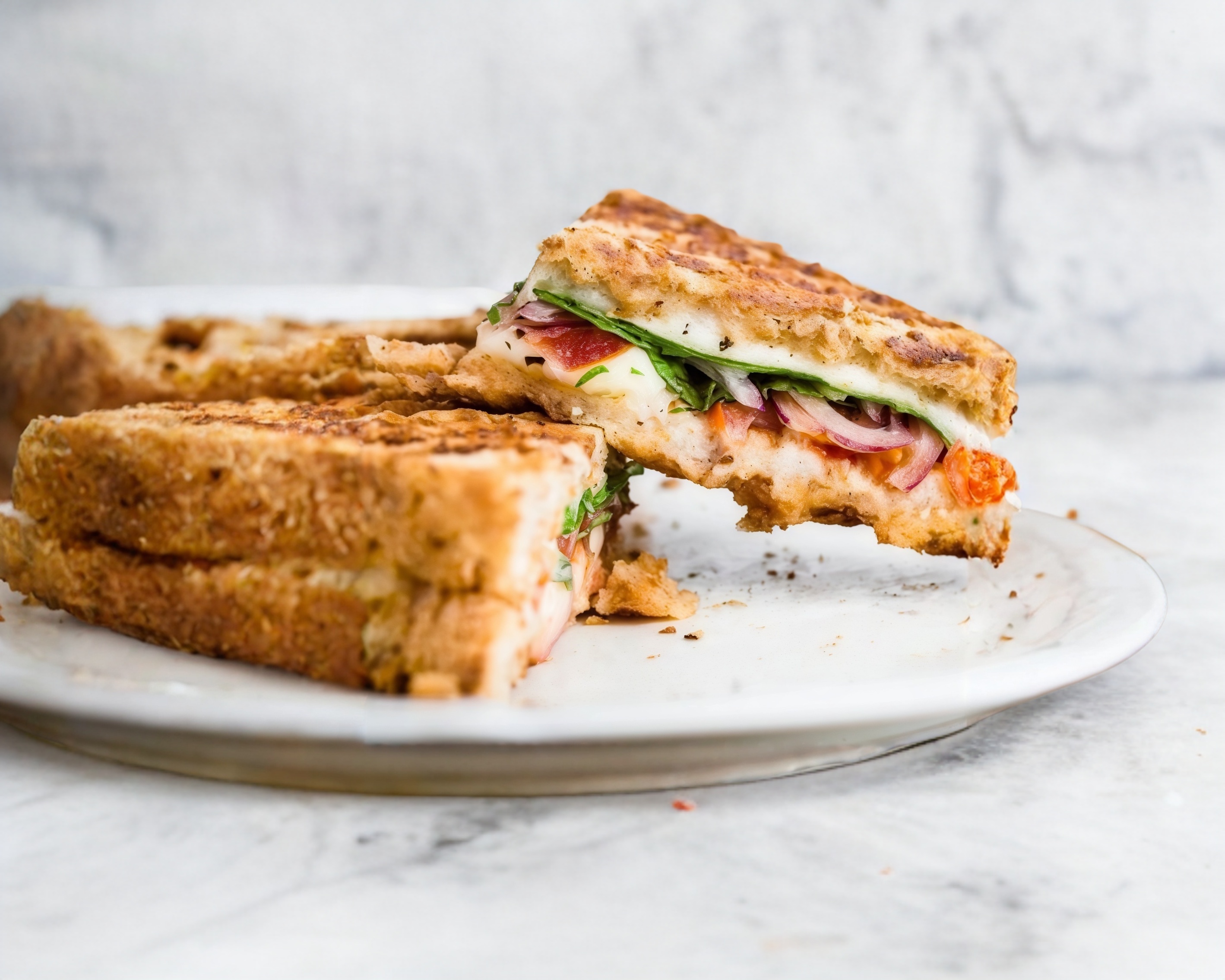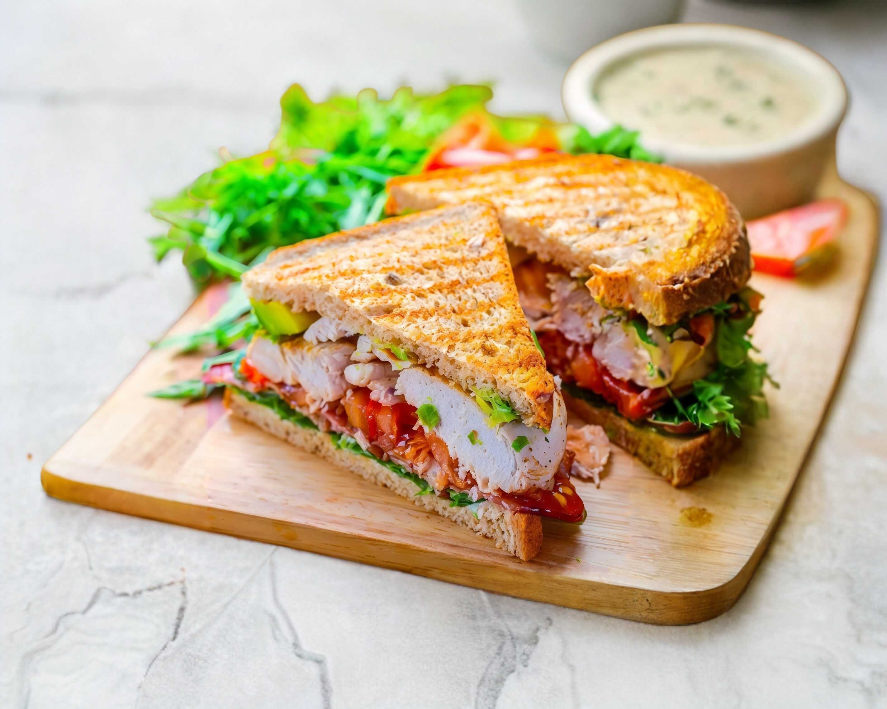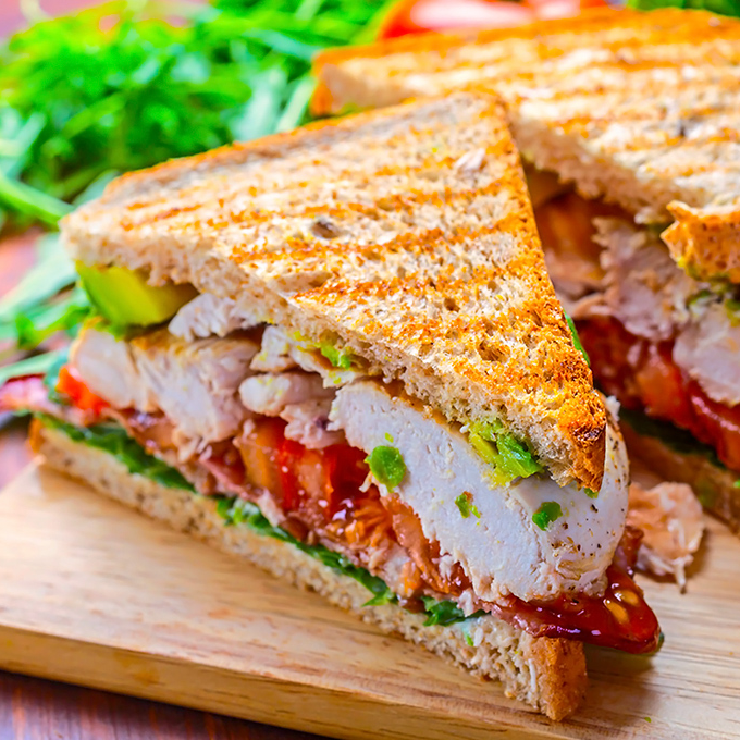 Delicioso sandwich tostado con fajitas de pechuga de pollo a la plancha, tomate asado, queso panela reduicdo en grasa asado, espinaca baby y mayoligth.