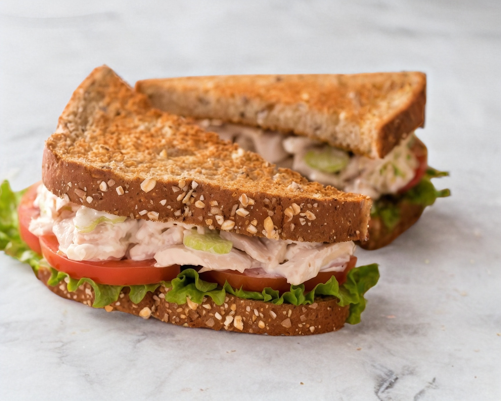 Delicioso sandwich de pan glutten free con ensalada de pollo preparada con elote, chicharo, brócoli, tomate, lechuga picada y aderezo mayolight.
